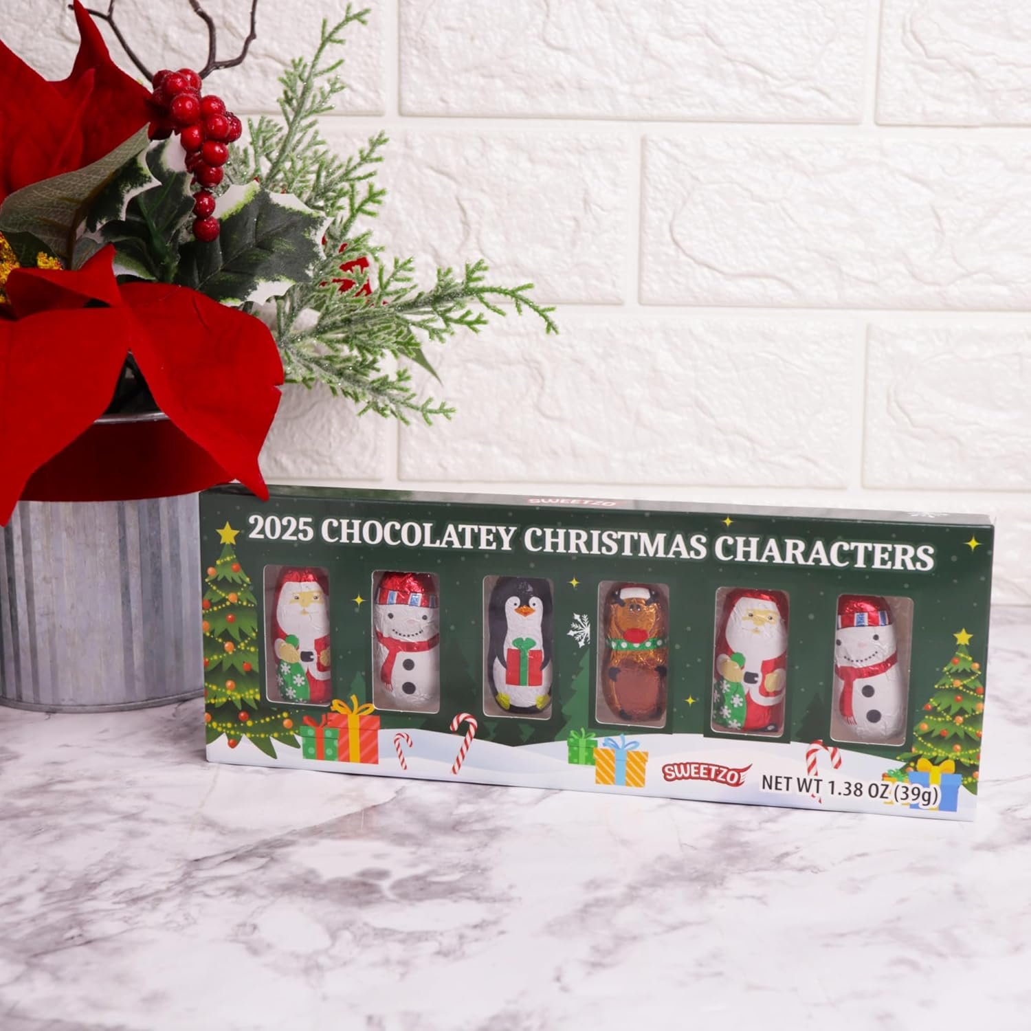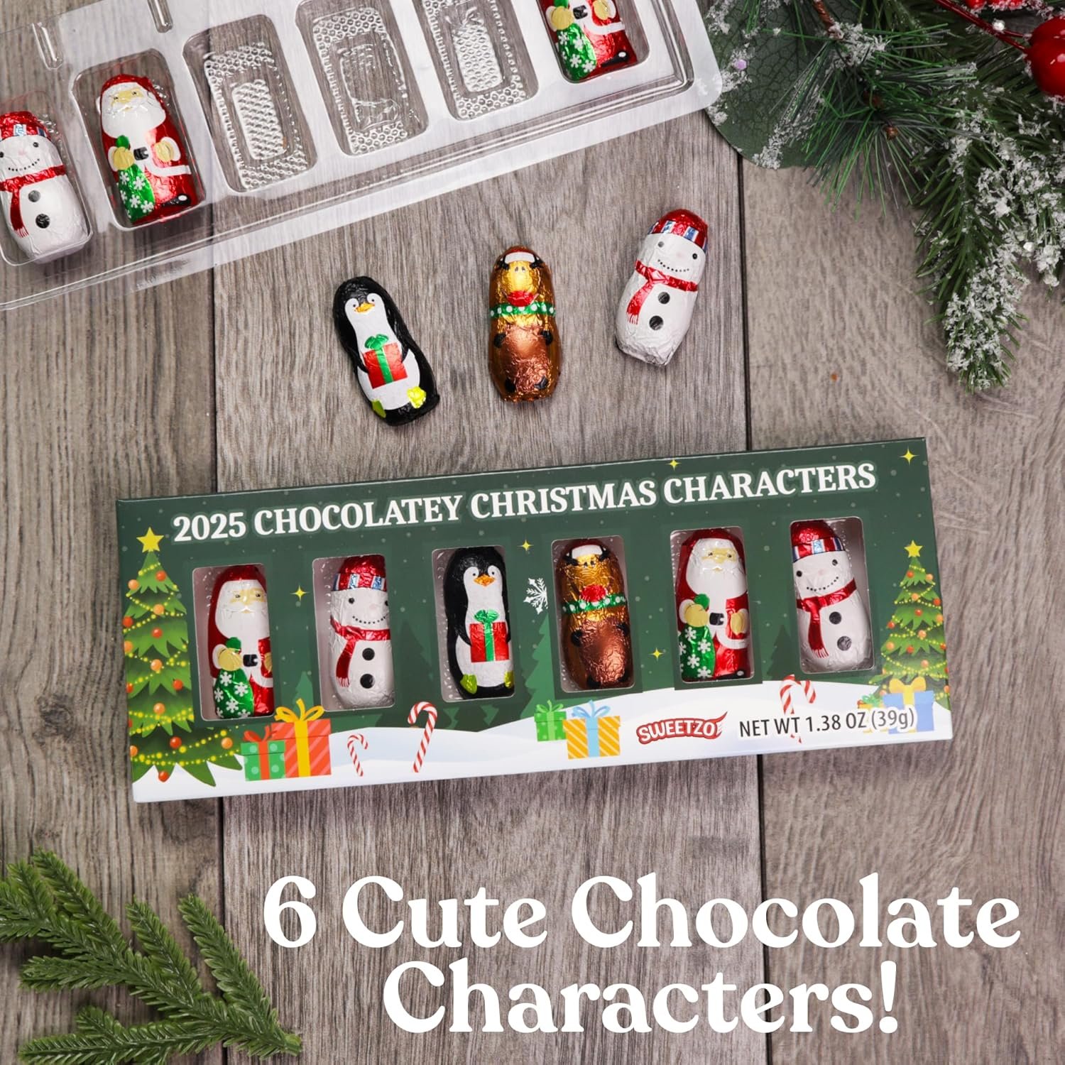 Bring holiday cheer to your celebrations with these Mini Chocolatey Christmas Characters, individually foil wrapped in festive designs featuring Santa, Snowman, Penguin, and Reindeer. This pack includes 6 bite-sized pieces, with a total weight of 1.38 ounces, making them a perfect stocking stuffer, holiday party favor, or gift basket addition. Their colorful holiday wrappers make them fun to display, share, and enjoy throughout the season.