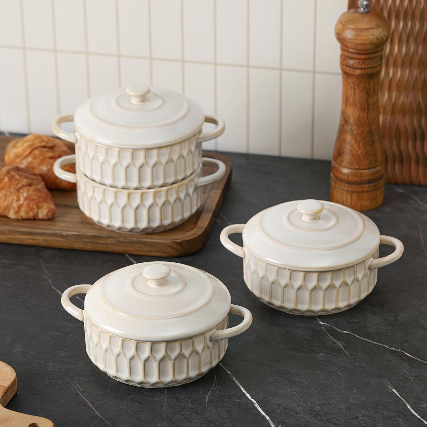 【Stackable and Save Space】Our Mini Ceramic Cocotte set are stackable, so you won’t waste your kitchen space and say goodbye to messy cupboard space. Stable and not prone to tipping,The lid can be independently leaned next to the bowl, saving more cupboard space and making storage safer