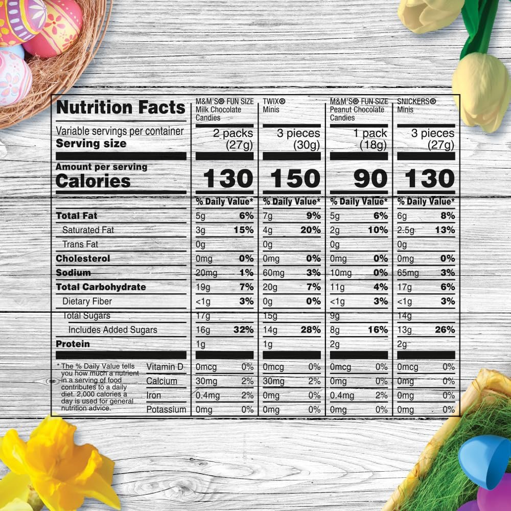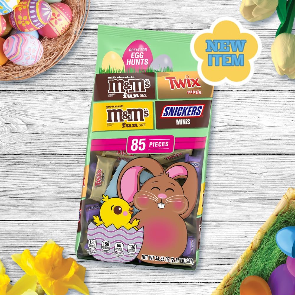 Contains one (1), 34.85-ounce, 85-count minis and fun size packs of SNICKERS, M&M’S and TWIX Easter Bulk Candy Assortment