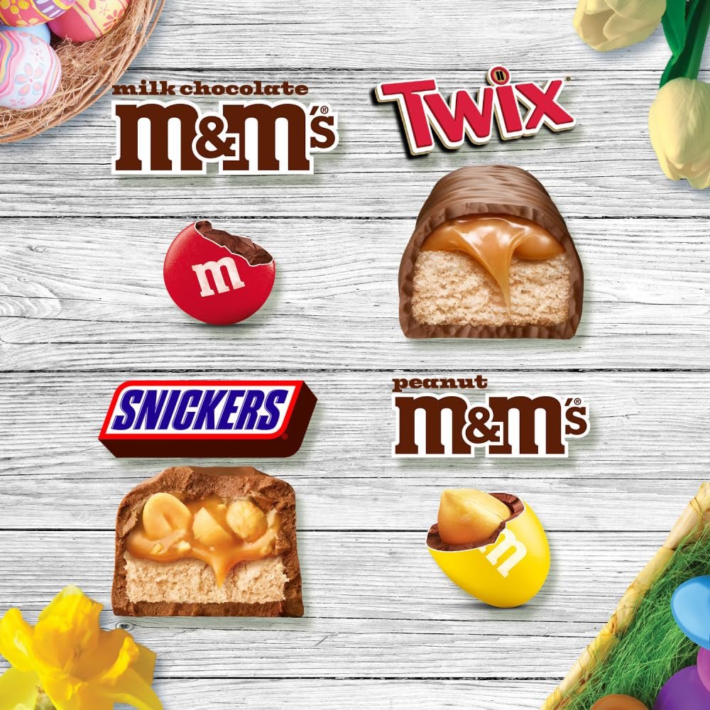 This bulk Easter candy bag features an assortment of mini SNICKERS Original, fun size M&M’S Milk Chocolate Candy, fun size M&M’S Peanut Chocolate Candy, and mini TWIX Caramel Cookie Bars