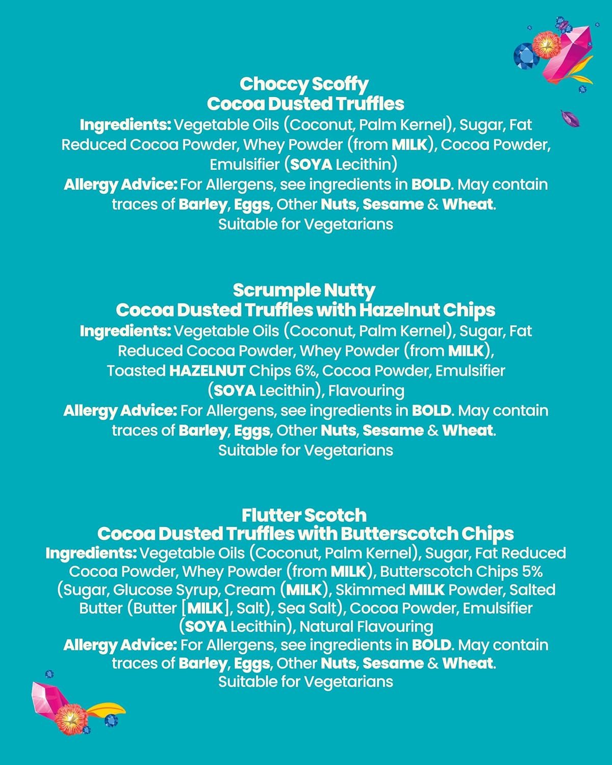 THREE DELICIOUS FLAVORS: Choccy Scoffy is our rich, original chocolate truffle flavor; Scrumple Nutty is a praline truffle packed with crunchy toasted hazelnut chips; and Flutter Scotch delivers a creamy butterscotch hit with a hint of sea salt.