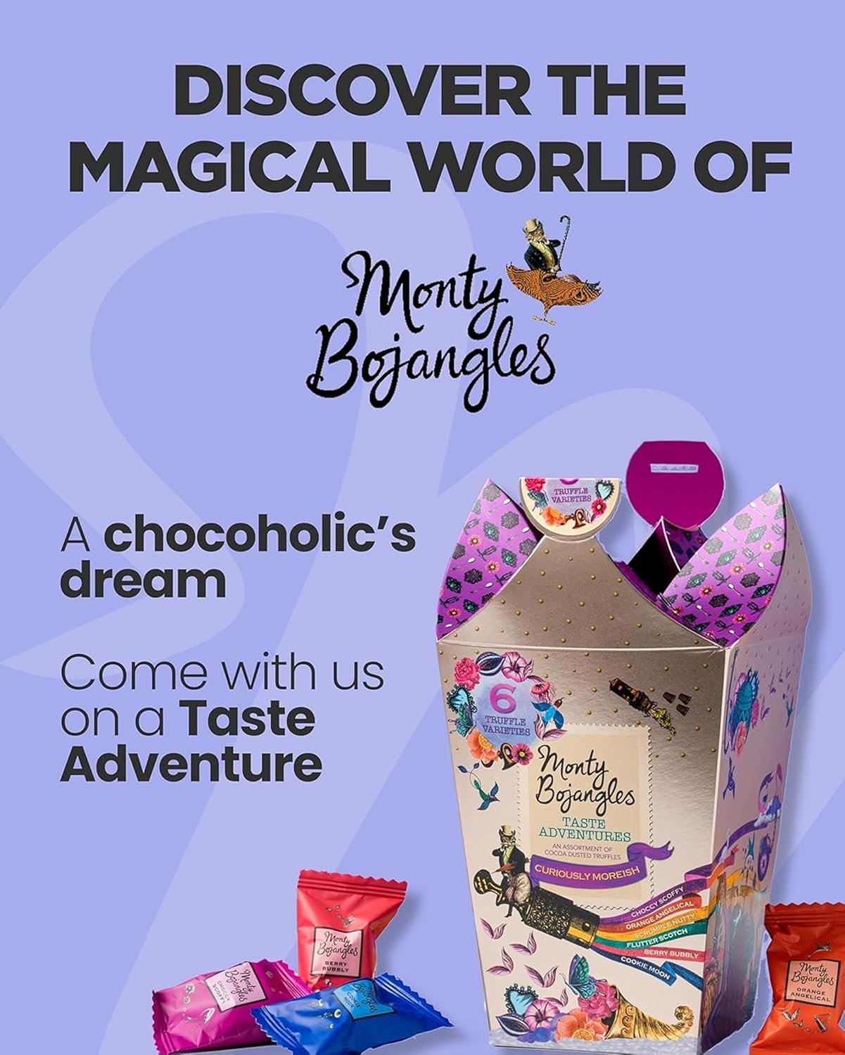 LUXURIOUS CHOCOLATE TRUFFLES: Discover the magical world of Monty Bojangles with our Taste Adventure Cocoa Dusted Truffles Gift Box. Indulgent luxury Chocolate Truffles in six incredible flavous. Suitable for vegetarians.