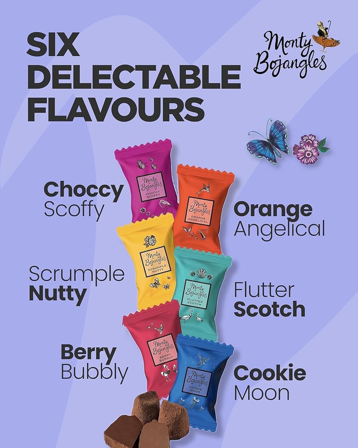 SIX DELICIOUS FLAVOURS: From our original Choccy Scoffy Cocoa Dusted truffles, to a zesty Orange Angelical truffle, rich salted caramel Flutter Scotch, nutty Scrumple Nutty, light and refreshing Berry Bubbly and comforting Cookie Moon.