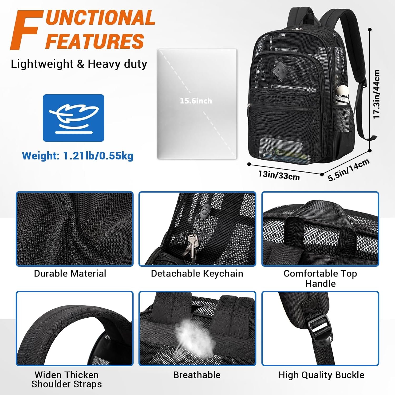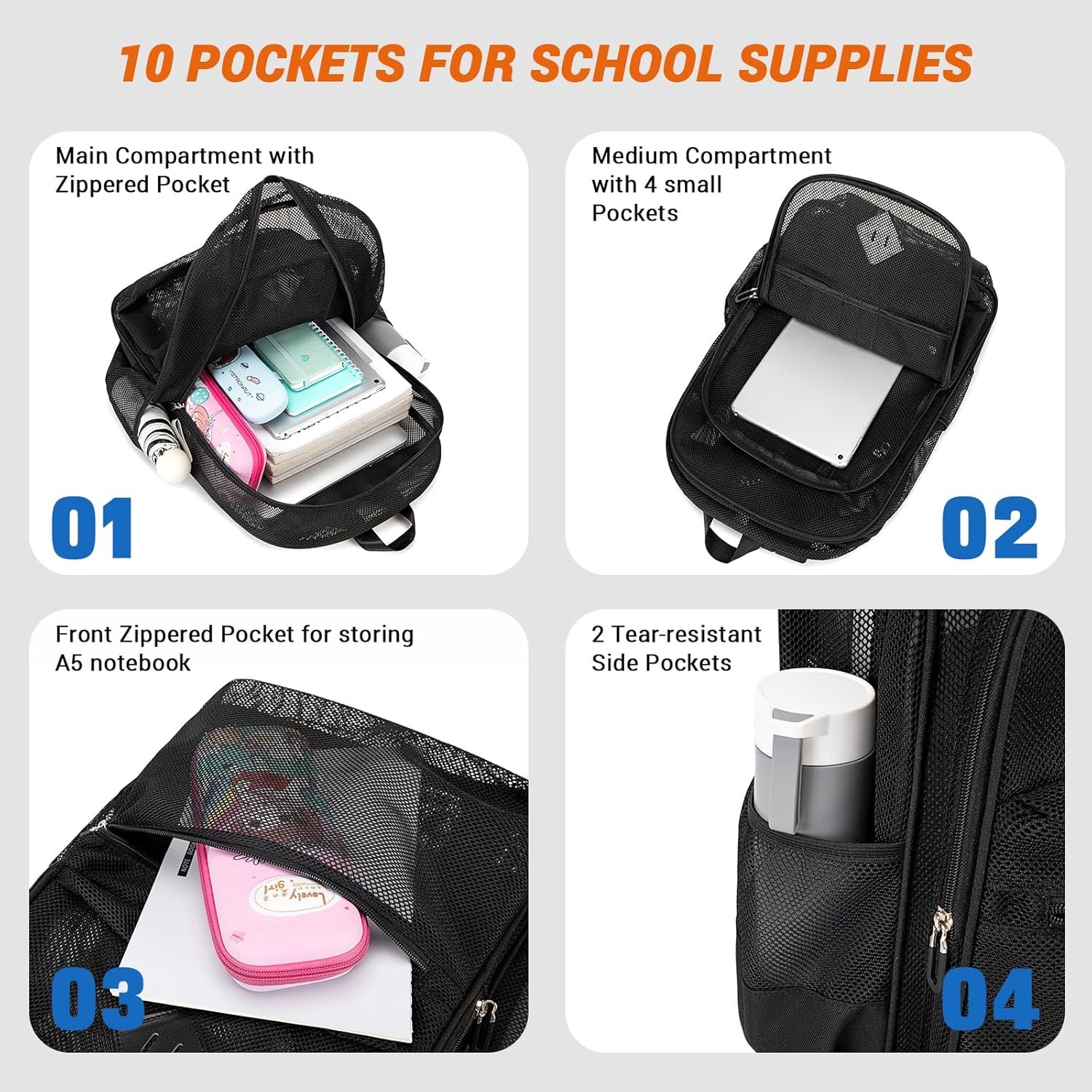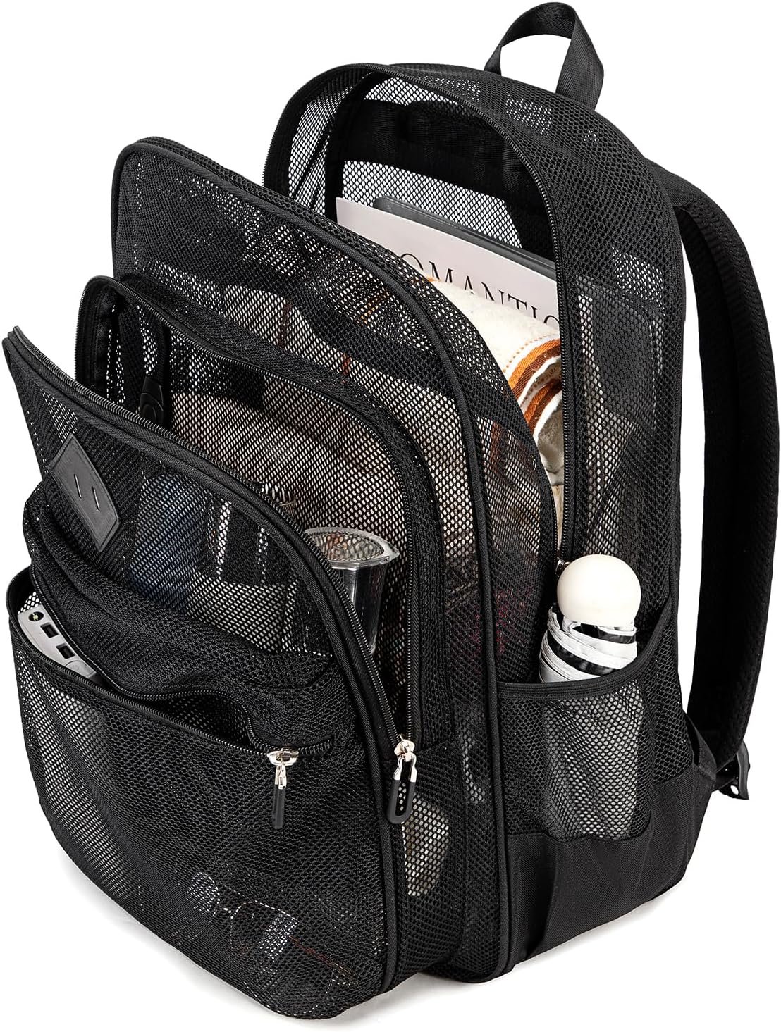 Semi-transprent mesh backpack with multiple pockets, suitable for school, work, soprt, beach, travelling, hiking, camping carry.