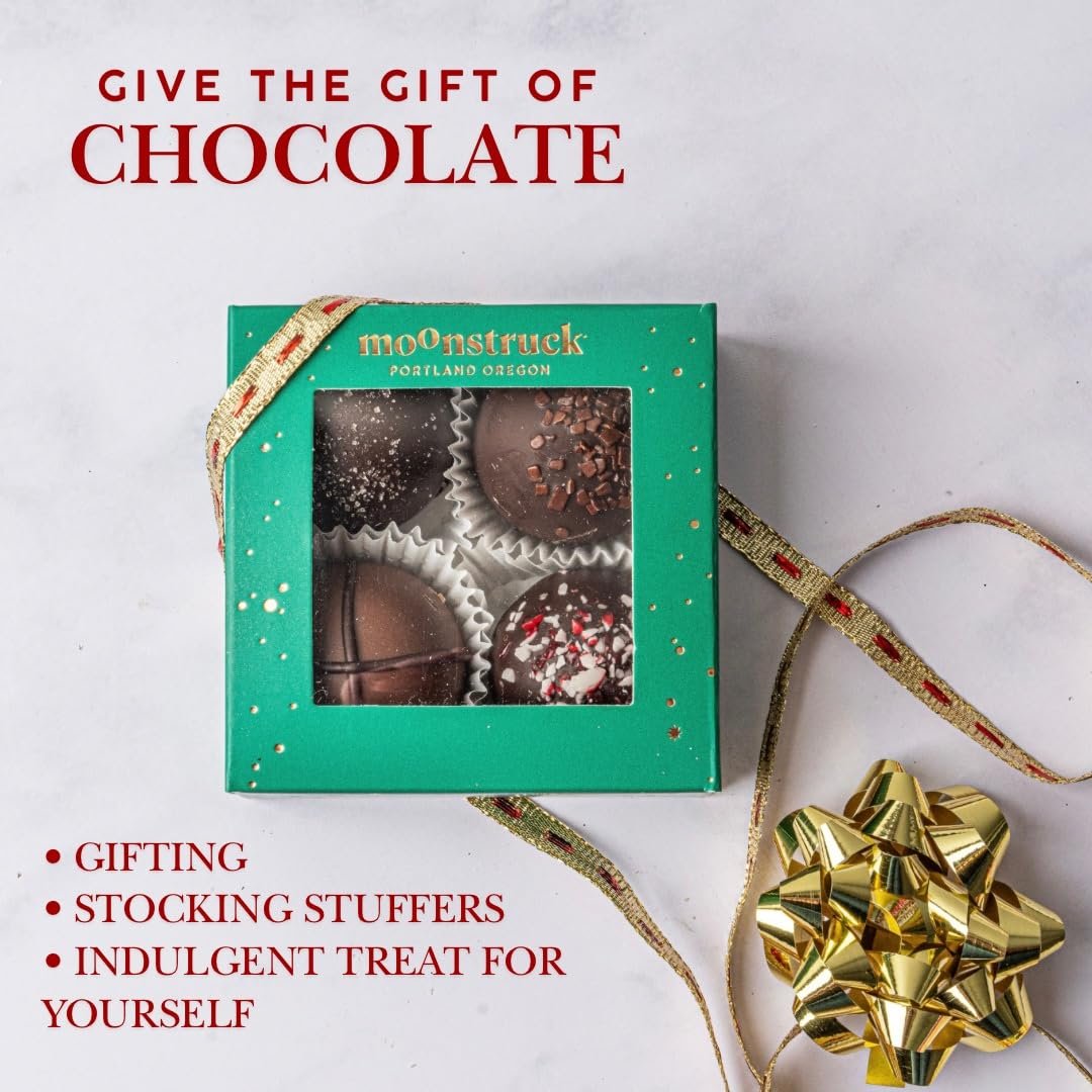 GOURMET QUALITY CHRISTMAS CHEER: With its beautiful packaging and delightful flavors, this Moonstruck Chocolate 4-Piece Holiday Truffle Box adds an extra touch of holiday cheer to any occasion. Perfect for spreading joy and sweet moments this season!