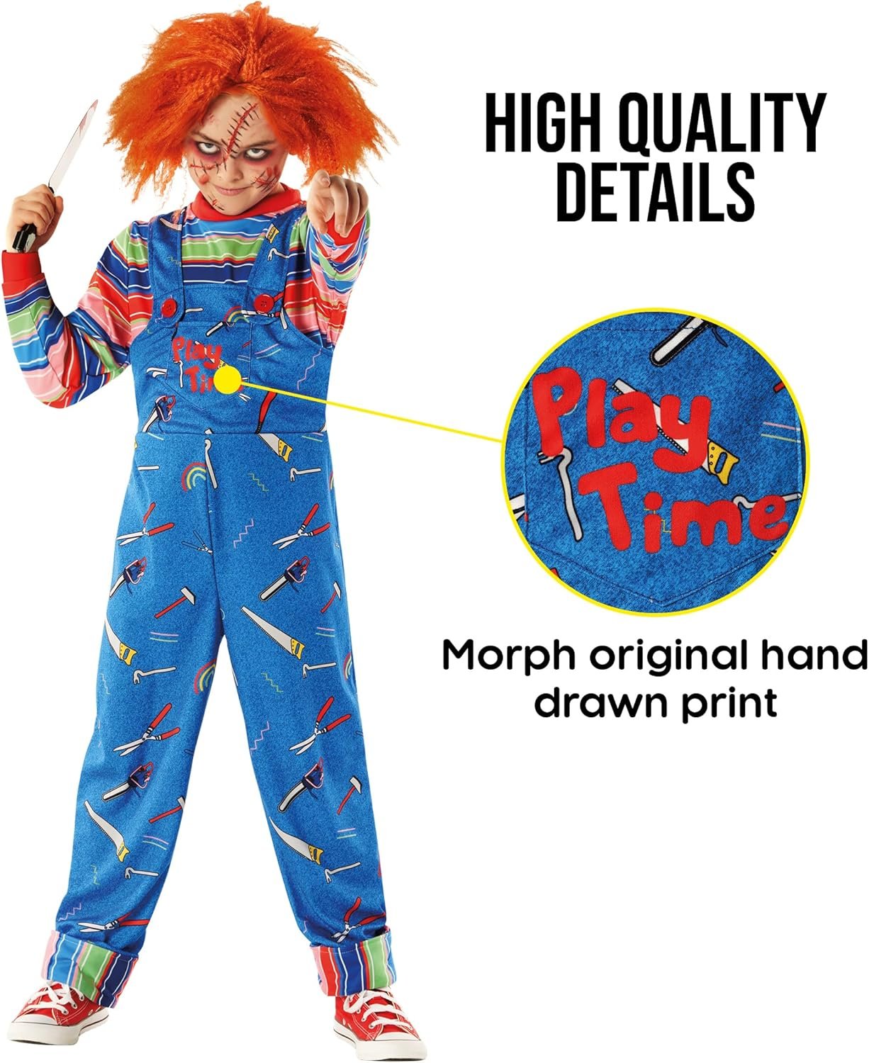 Our playtime killer costume includes a blue jumpsuit with signature tagline and striped top, ginger wig is also included Available in 3 sizes! Our scary playtime costume comes in Medium (7-9 Years), Large (10-12 Years) and X-Large (12-14). Please refer to the size guide found in images for further sizing information. Our blue jumpsuit features a Morph Costumes original digital print, with a Velcro fastening under the buttons for ease of wear. Perfect for a Halloween costume for toddlers, costume parties and more. Halloween costumes for kids, movie character costumes kids, boys halloween costumes kids, scary halloween costumes for kids, scary halloween costume kids, scary halloween costumes for boys