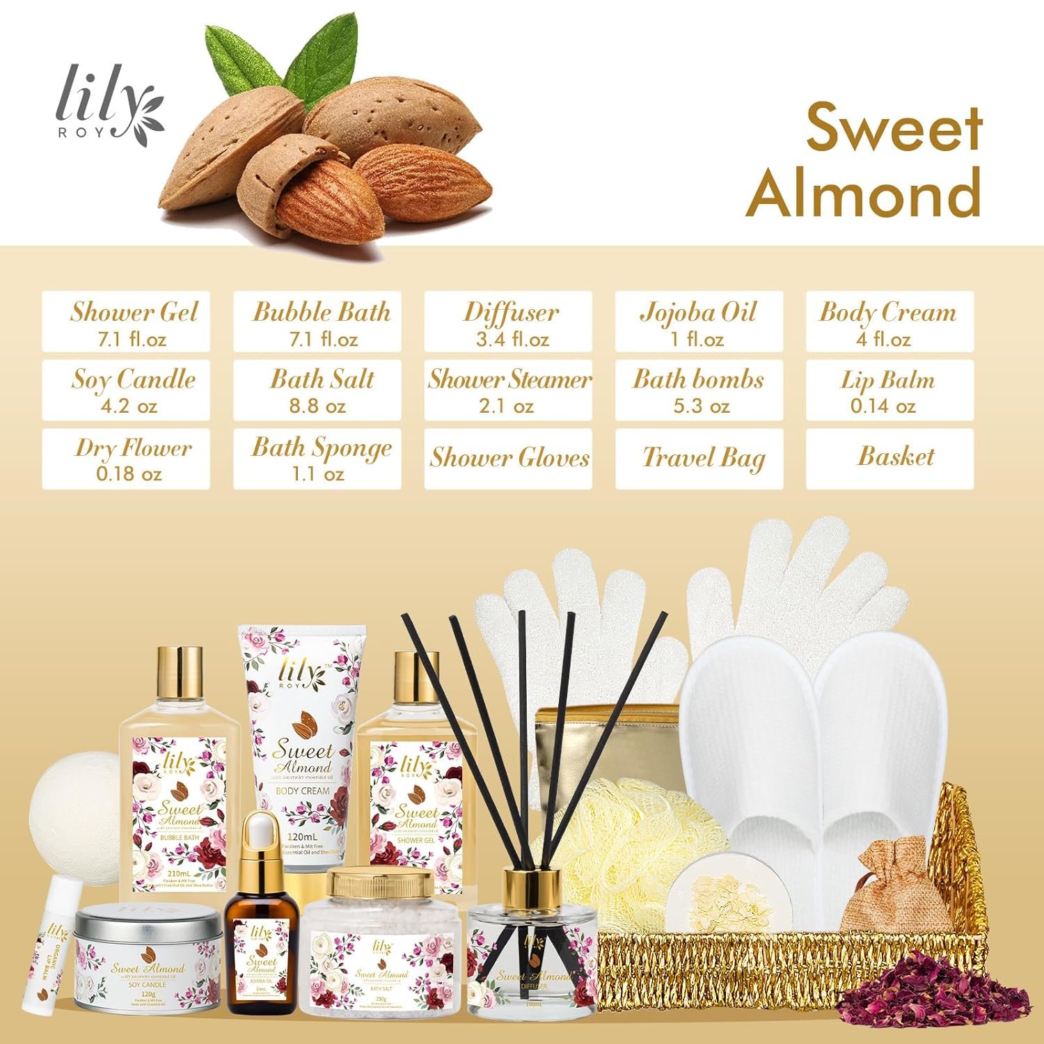 17 PCS SPA GIFT BASKET SET FOR WOMEN: shower gel, bubble bath, body cream, diffuser, jojoba oil, bath bomb, bath salt, shower steamer, dry flower, bath sponge, reed diffuser stick, shower gloves, travel bag, waffle slipper packaged in a nice natural beautiful basket. The 17 pcs girls’ spa set offers the most luxurious and perfect bath experience