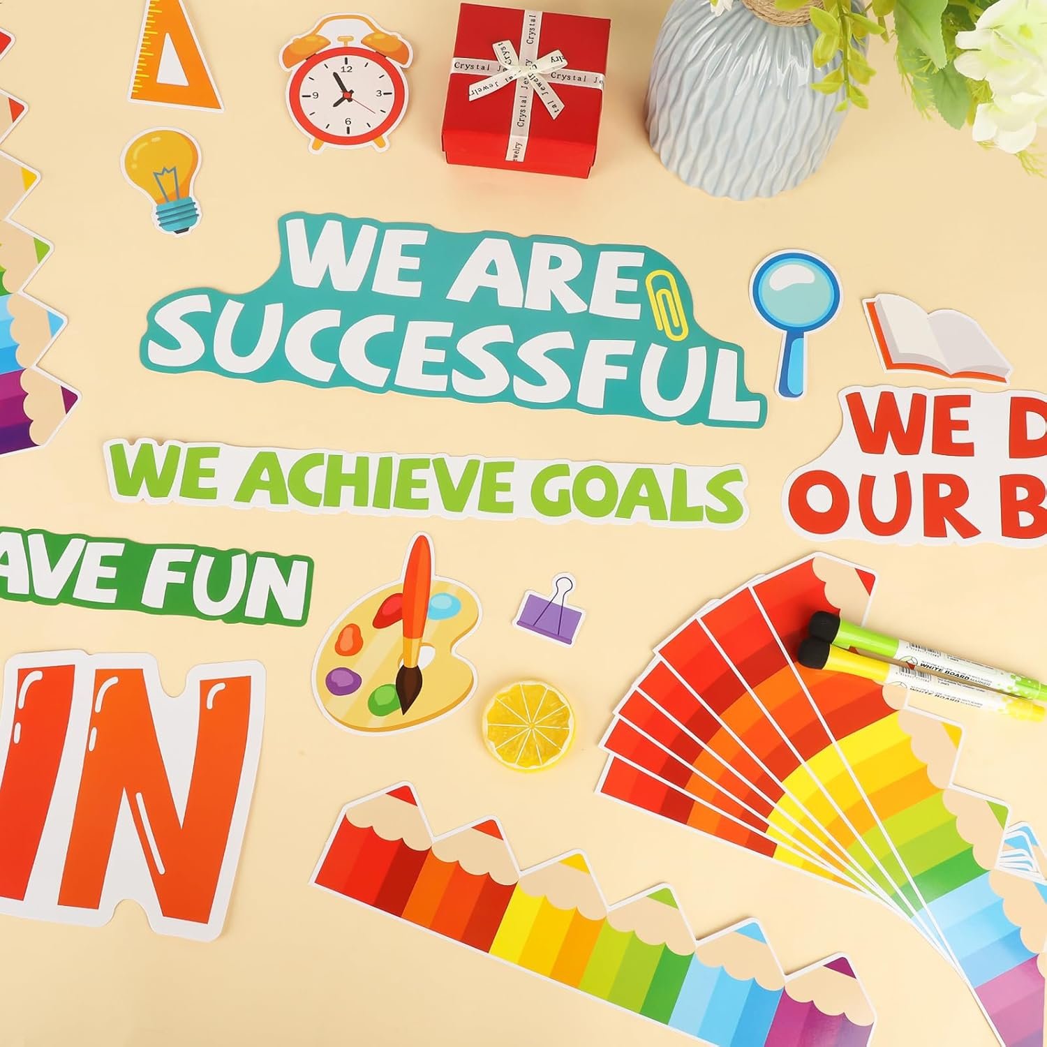 Package Includes: 34 sheets of classroom bulletin board decorations, including 18 colorful motivational school bulletin board cutouts in different styles, 16 pencil-shaped bulletin borders, and enough self-adhesive dots.