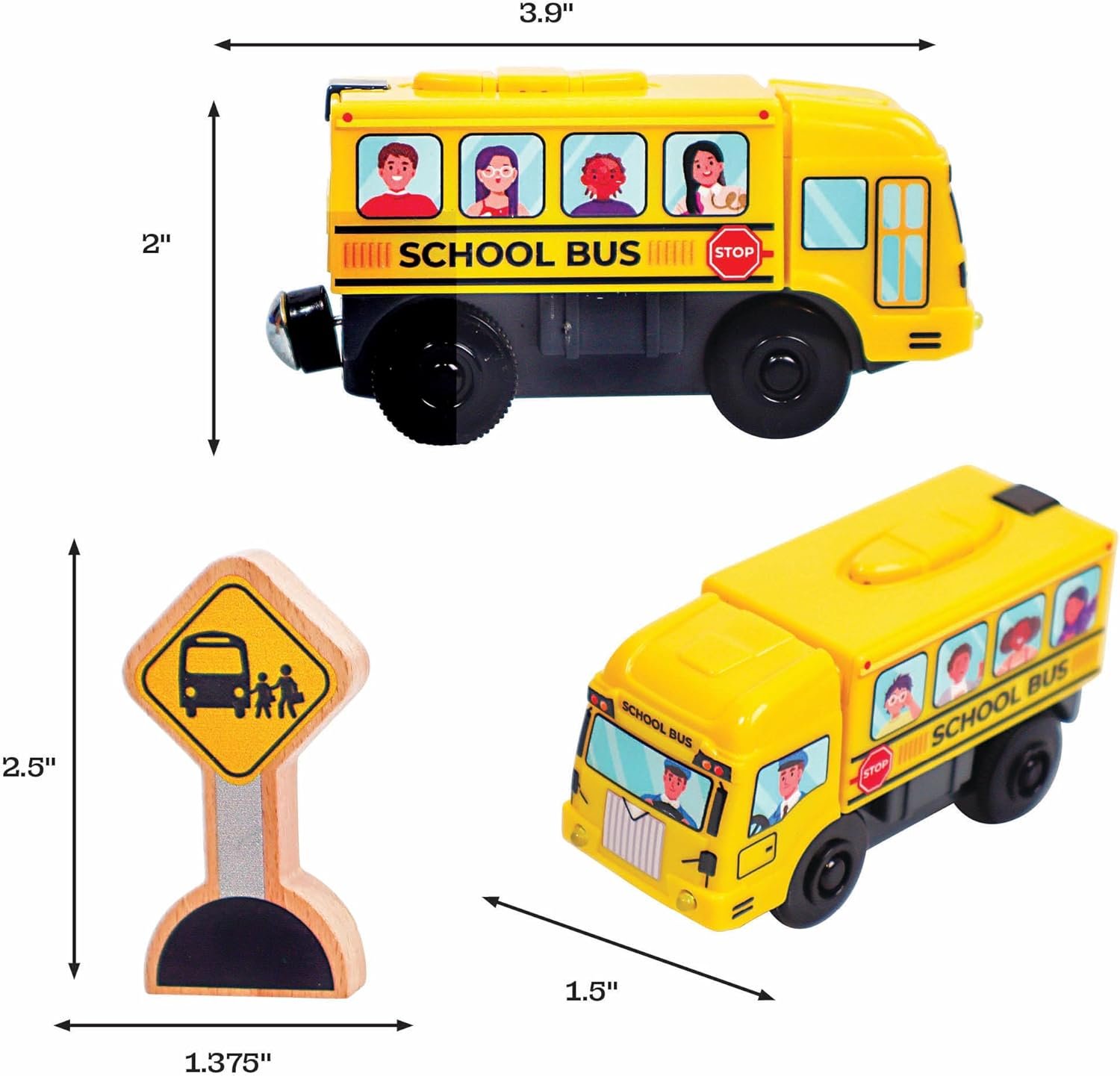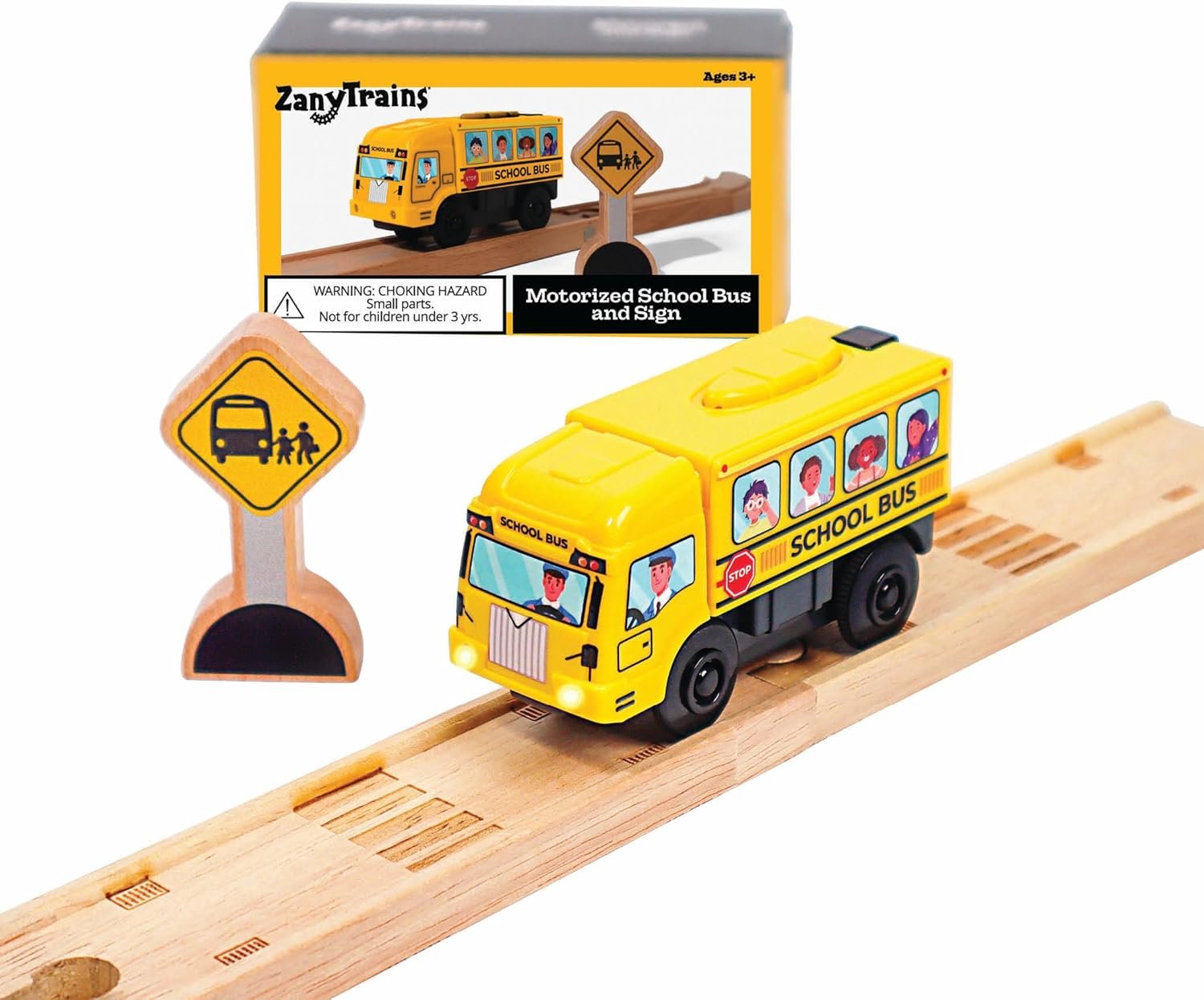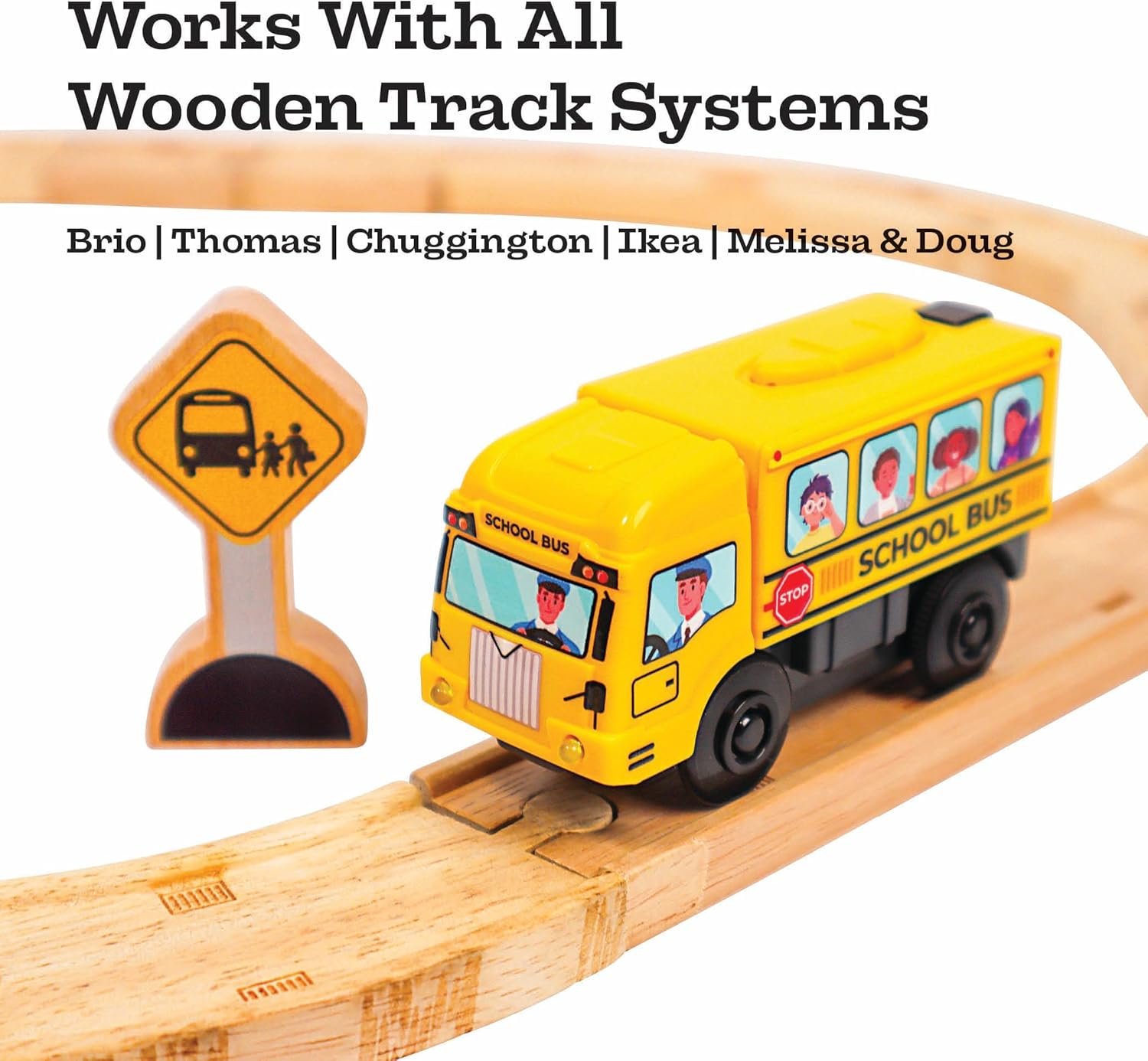 MOTORIZED SCHOOL BUS WITH LIGHTS AND SOUND – Motorized school bus for wooden track, great for any wooden city! REQUIRES 2 AA BATTERIES (NOT INCLUDED) – Includes 1 Motorized Train, 1 Wooden Bus Stop Sign, and Collectible Poster ITS TIME FOR SCHOOL! This fun motorized School Bus is sure to add plenty of imaginative play to your wooden railway. STRONG MAGNETS FOR ENDLESS PLAY – Each Zany Train has magnetic connections to easily connect the toy engine to other wooden trains. Perfect for your tiny conductor! COMPATIBLE WITH ALL WOODEN TRACK SYSTEMS – Zany Trains can ride on all wooden railway toys, track and pieces. Compatible with Brio, Thomas Wooden Railway, Chugginton, IKEA, Imaginarium, Melissa & Doug, and more!