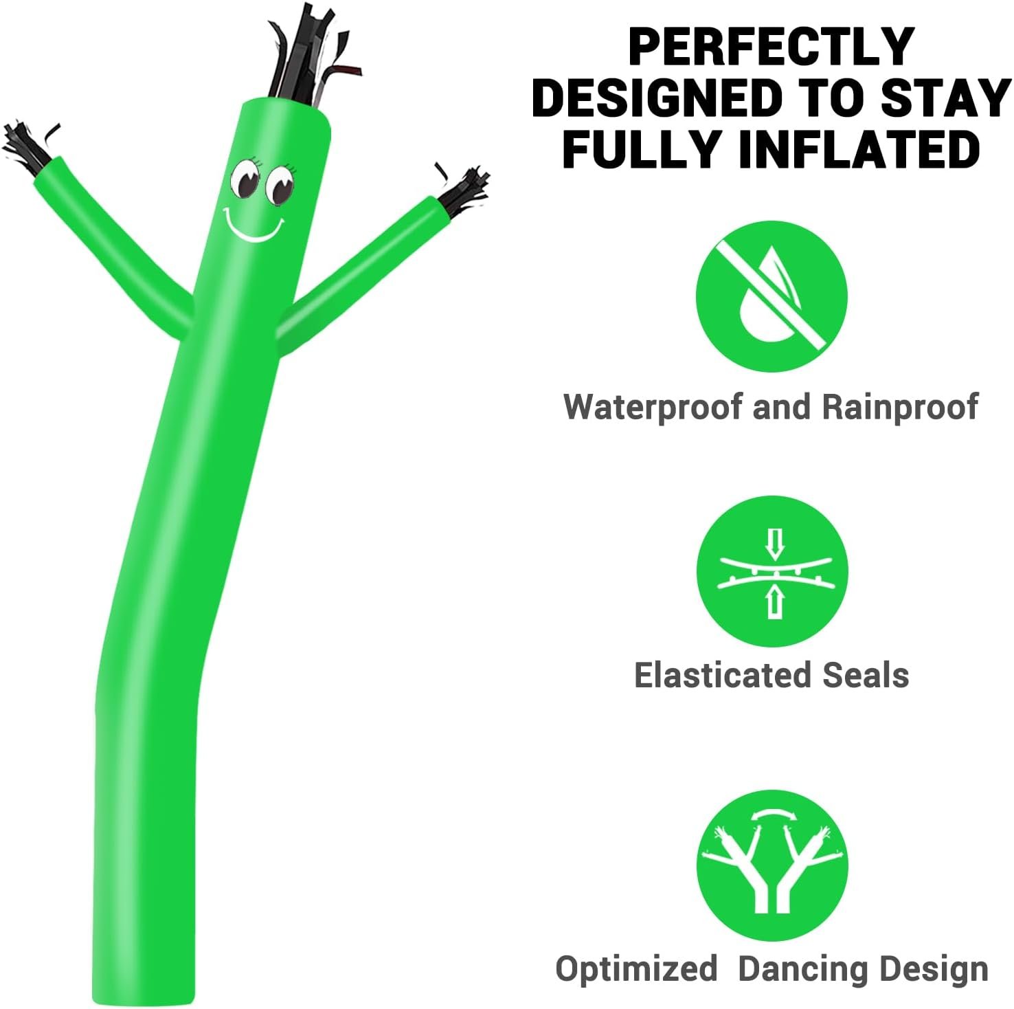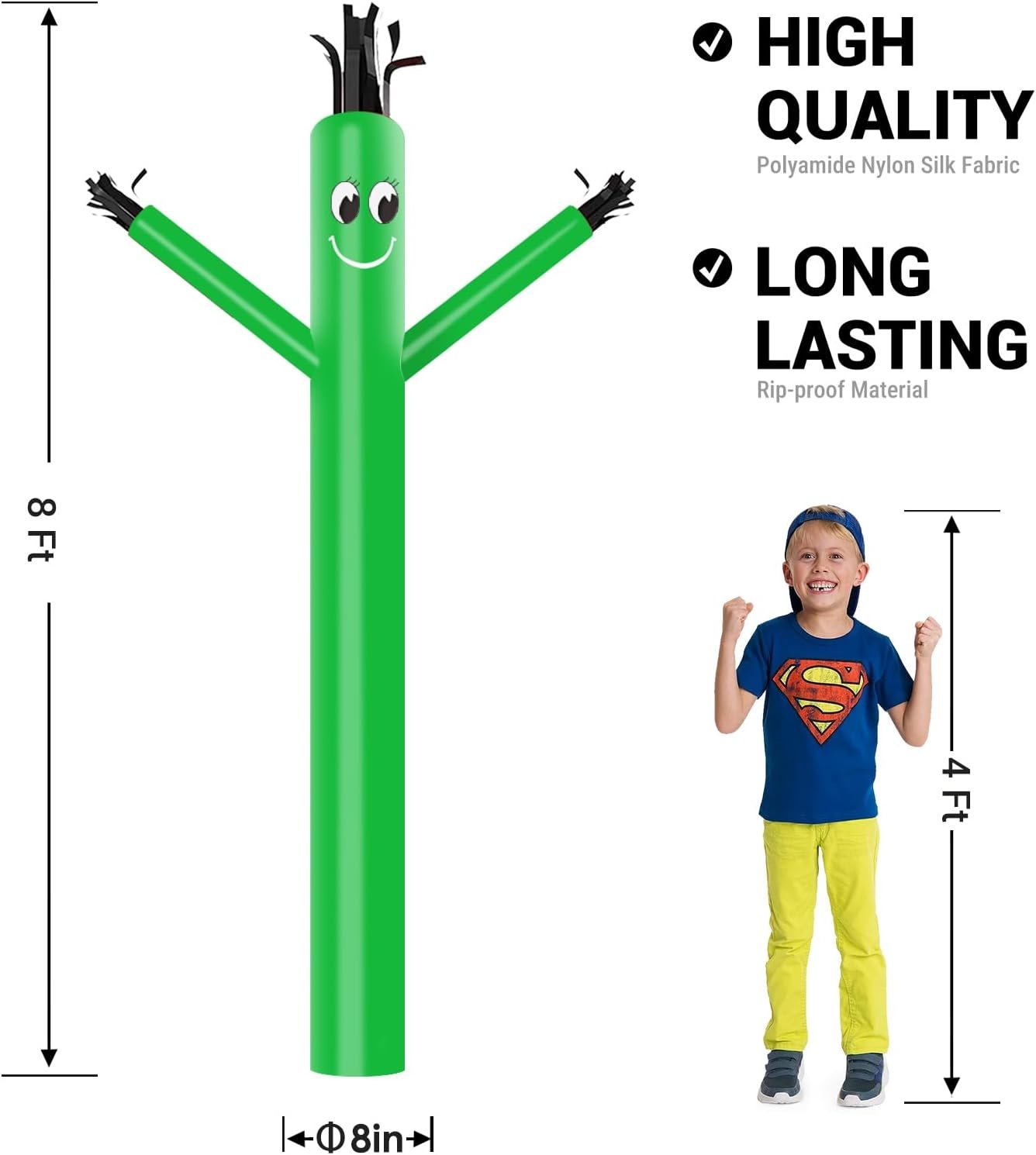 This is the dancer replacement for MOUNTO 1/3hp 8ft dancer blower. Rip resistant and UV resistant, this advertising product is made to work hard and last long. Size: 8ft tall, 8” diameter Material: High strength polyamide nylon silk Assembly: Velcro attachment to the blower Blower Requirement: 8″ Diameter Blower Package Included: 1 X Inflatable Tube Man (NO BLOWER)