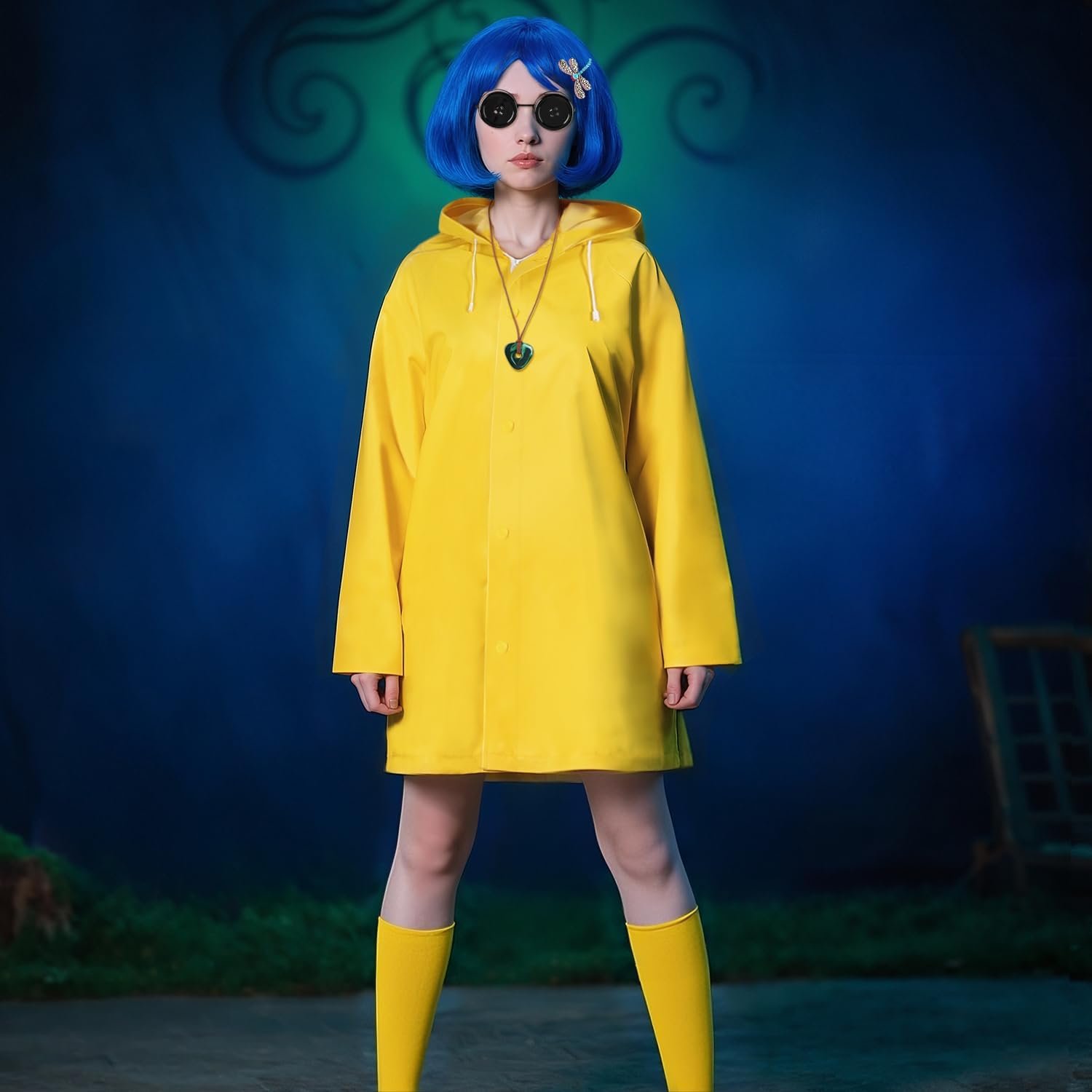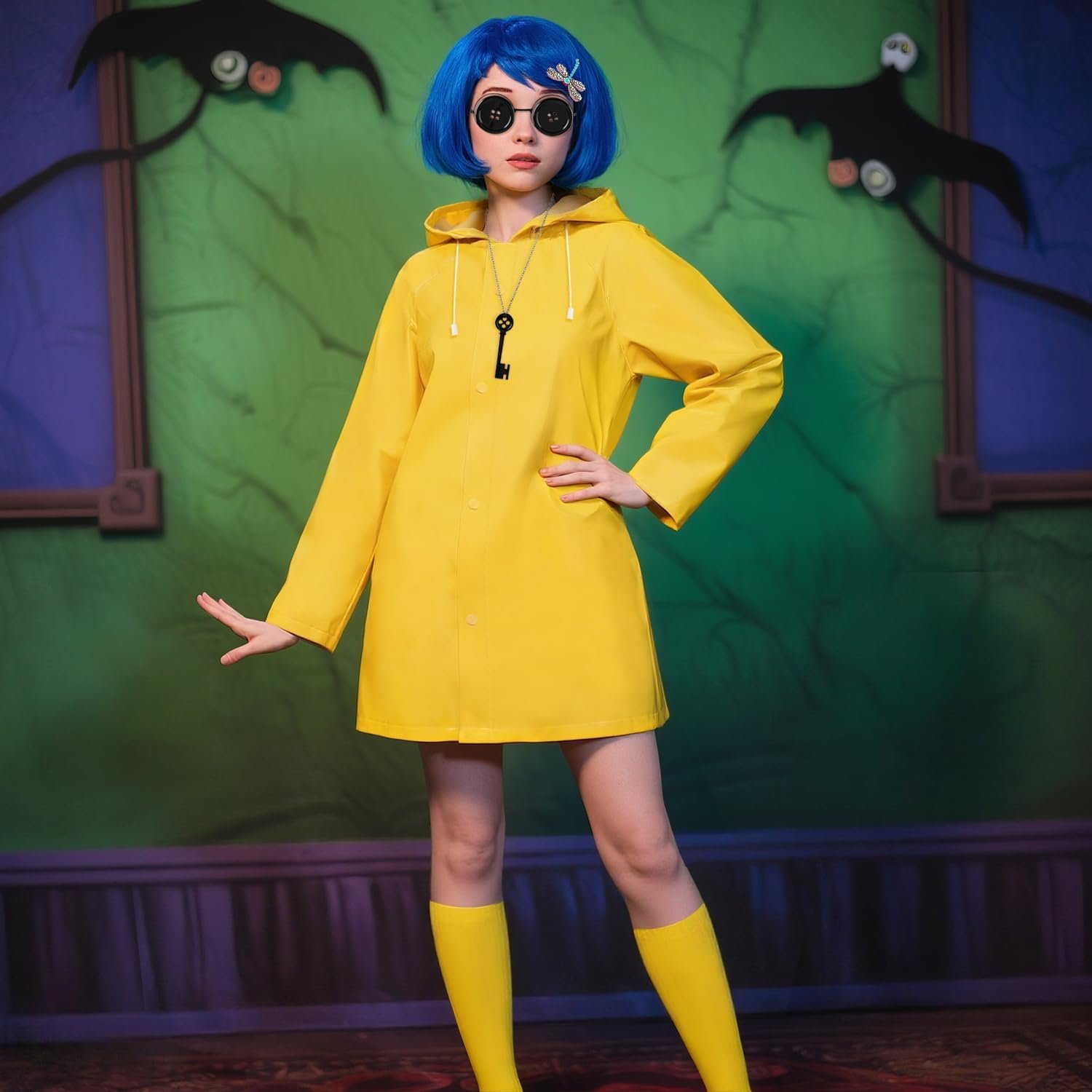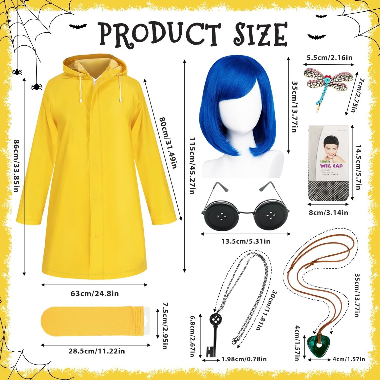 Step into an enchanting world with this 7-piece fantasy costume set, designed for women and teenage girls who love adventure, mystery, and magical journeys. Featuring a vibrant blue wig, a yellow hooded raincoat (86cm/33.8in long), and yellow crew socks, this set channels a bold, adventurous character with a whimsical twist.
