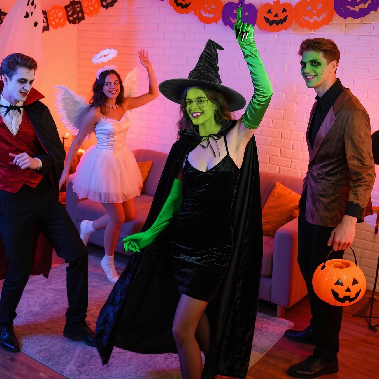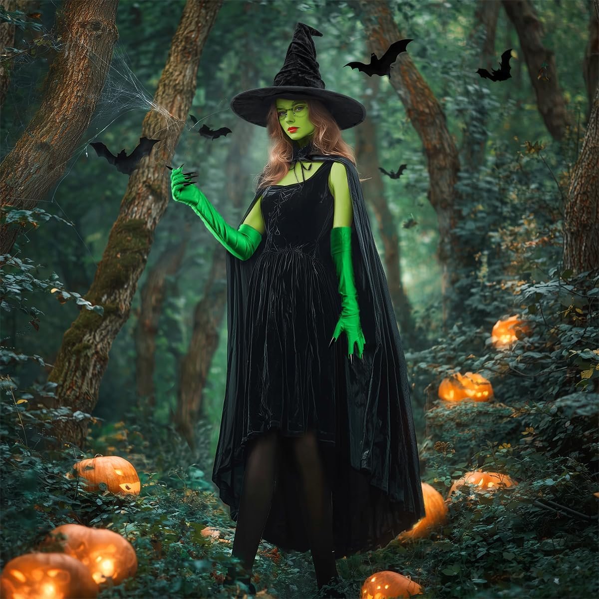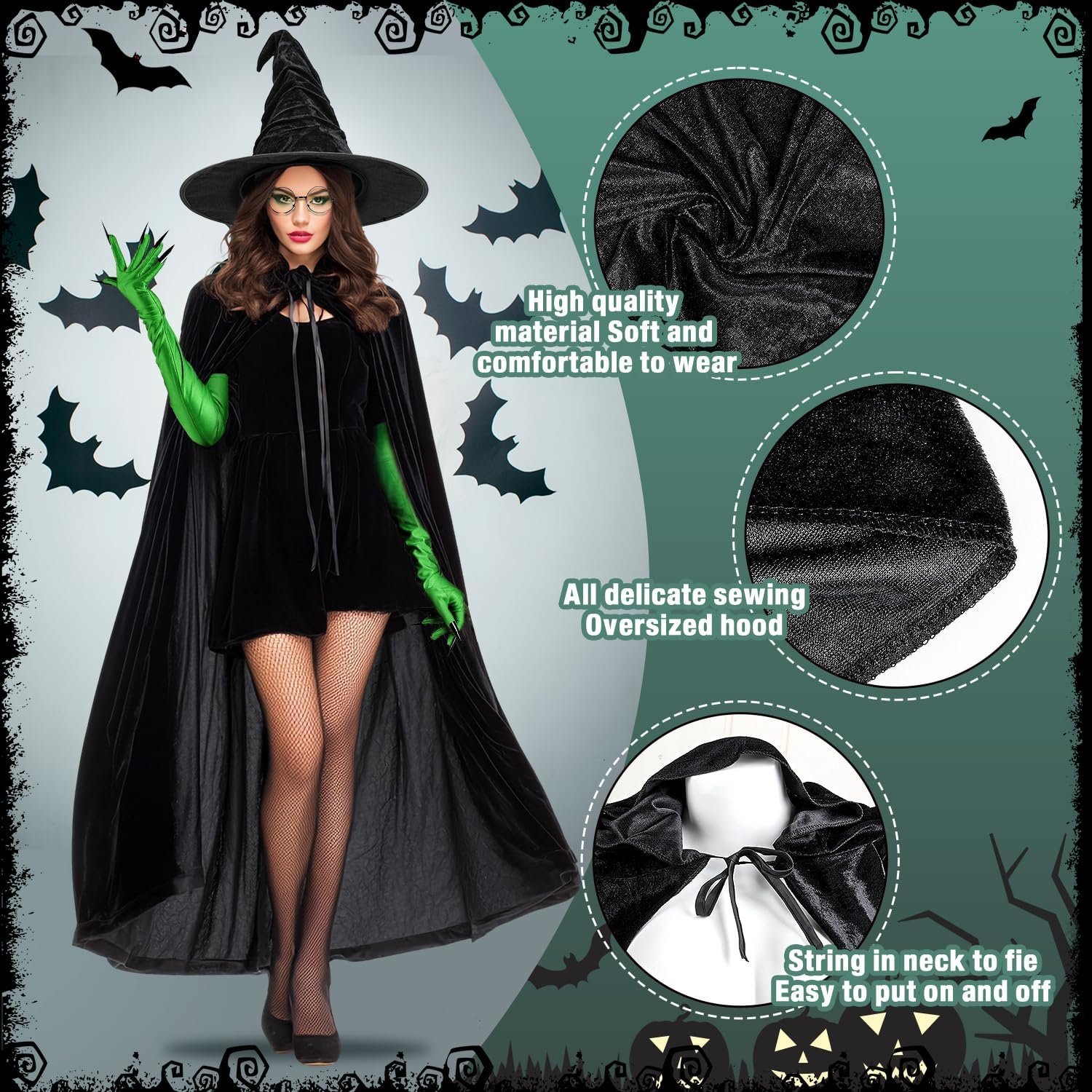 Unleash your inner witch this Halloween with this 5-Piece Witch Costume Set, designed to transform you into a powerful, green-faced sorceress ready for any magical adventure. The set includes a black satin hooded cloak, a dramatic witch hat, round black-framed glasses, long green gloves with sharp black nails, and a washable face paint kit to achieve the iconic witch look.