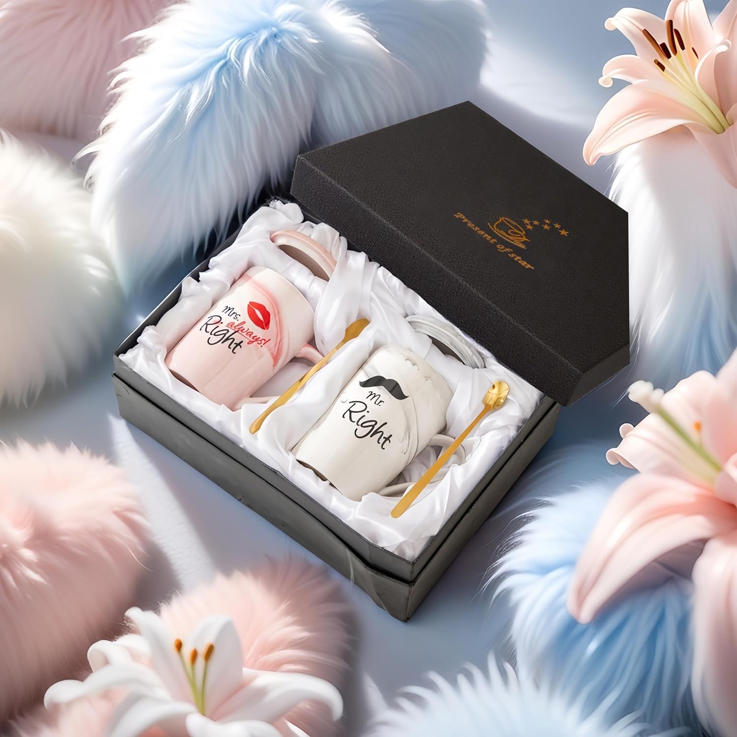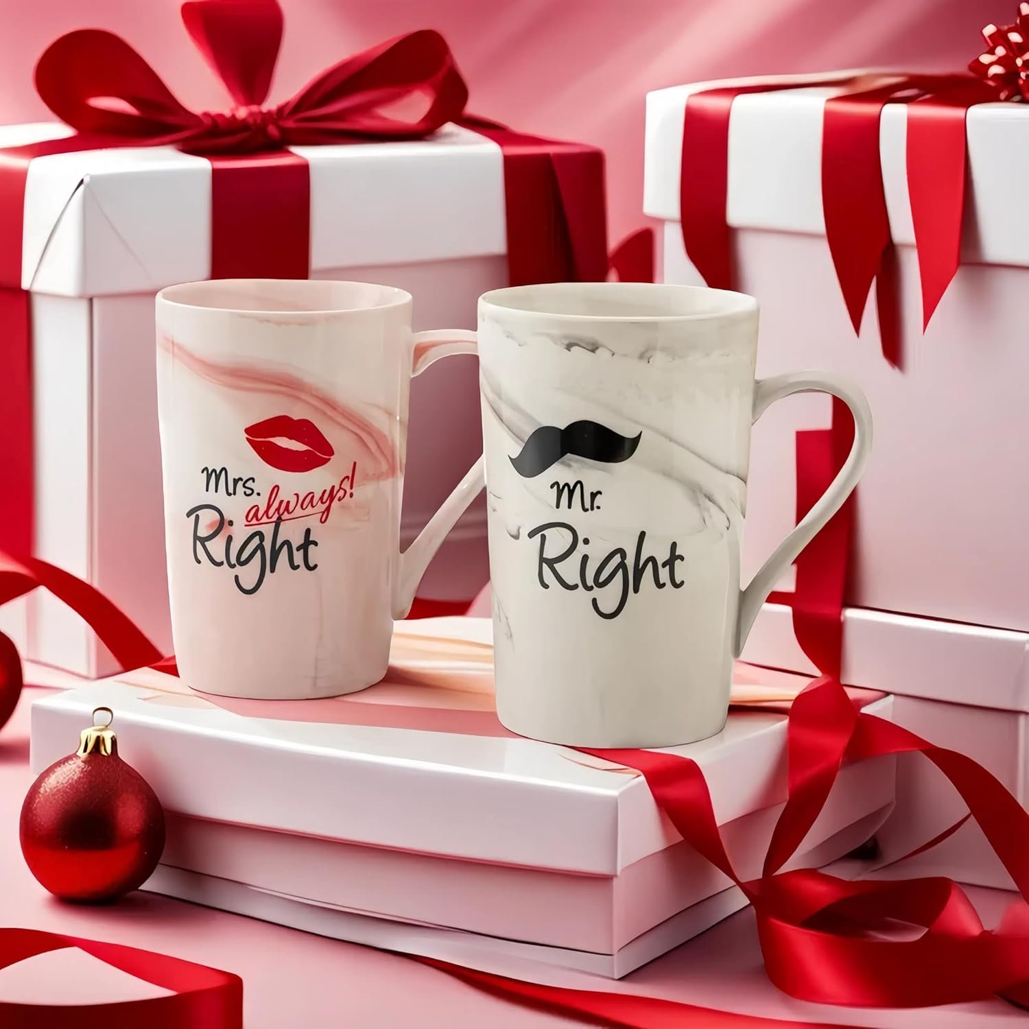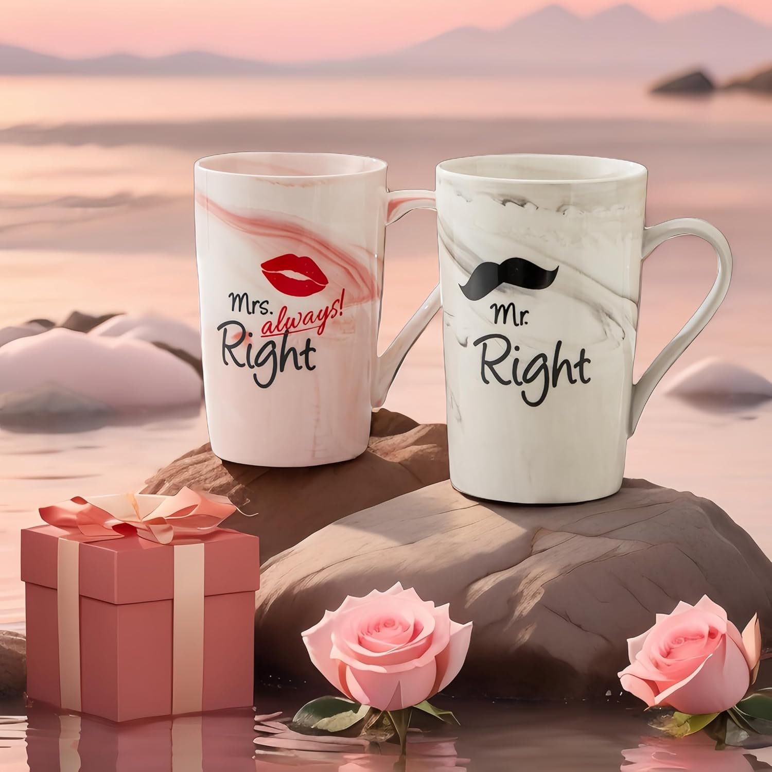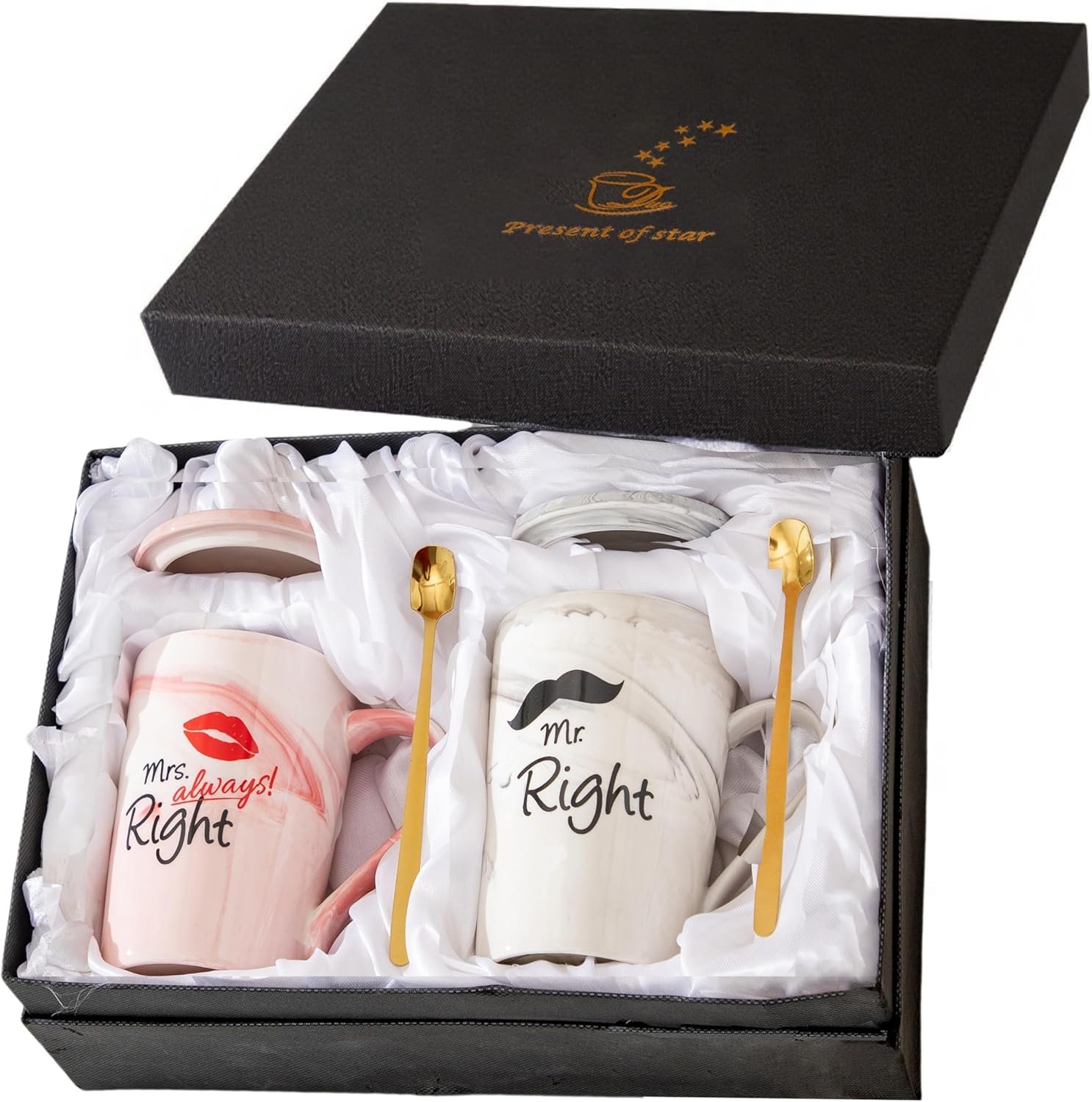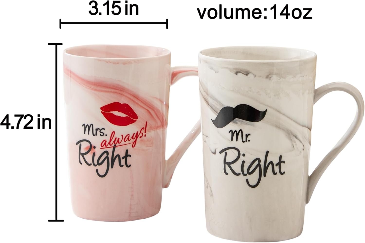 COUPLE MUGS GIFT READY: Beautiful matching set packaged within black gift box makes an ideal wedding, engagement, anniversary, or bridal shower gift.CLASSIC DESIGN: Elegant white ceramic coffee mug set featuring ‘Mr right’ and ‘Mrs always right’ text in stylish typography for couples.