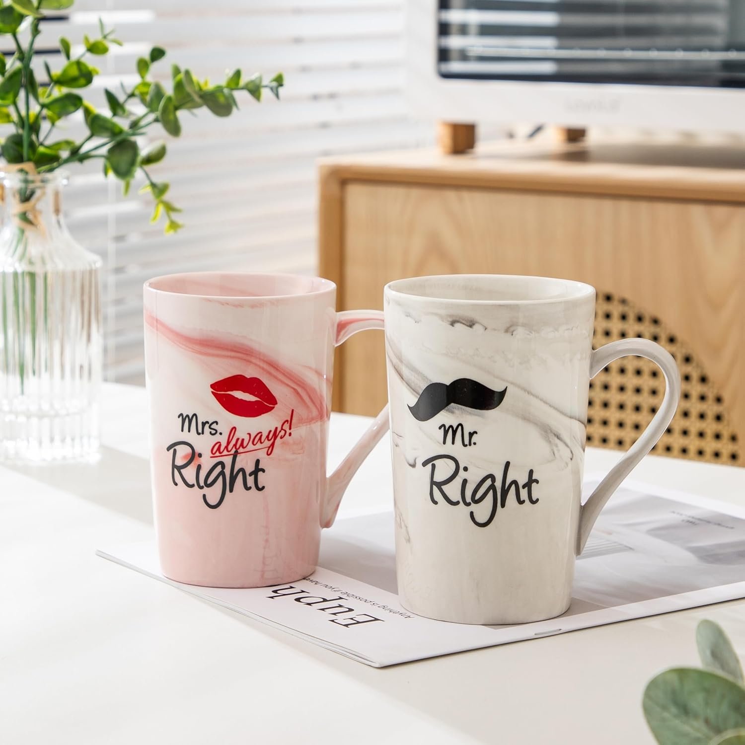 Mr Right and Mrs Always Right Mugs Gift for Couples A cozy kitchen counter with a product and a vase of fresh flowers.A cozy kitchen counter with a product and a vase of fresh flowers.