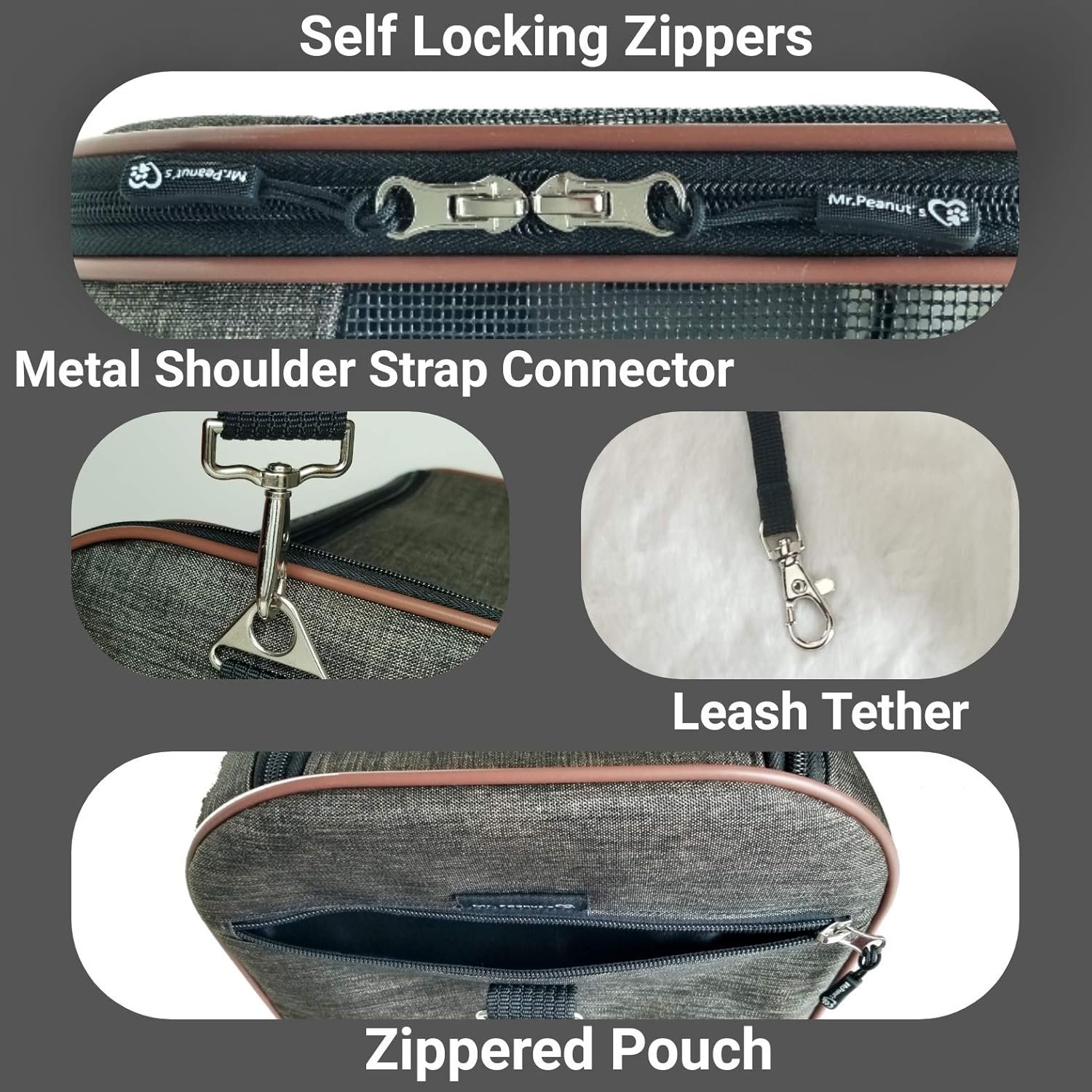 Zippers – These are one of my pet peeves as the zipper quality can turn a fantastic carrier into a loser very fast. When the zipper breaks at the airport or even in your car your carrier of choice becomes basically worthless. Make sure the brand you are looking at includes hi quality zippers from a reputable zipper brand. My totes are all designed with only premium brand zippers, and I improve and upgrade them often as new and better versions come along including the automatic self locking zippers which cannot be opened from inside that are used on this tote. Its much better than the old style clasps.What Are Self Locking Zippers and Why Do I Want Them? – About 18 months ago I switched my entire line up of carriers to self locking zippers. Self locking zippers are zippers which are designed in a way that they cannot be pushed open from the inside of the bag. I switched the entire line from the older style locking clasps as I found over a long period of time that the clasps in both metal and plastic were fragile and not durable. The self locking zippers remove the need for clasps, and actually results in a much safer tote for pets, and users overwhelmingly prefer them as they do not have to rely on using the small unreliable clasps. The old style clasps simply do not meet my standards. I always focus firstly on pet safety and comfort, and the reason I switched all of the models to self locking zippers is exactly for that reason.Carrier Structure – Soft Sided Pet Carriers by definition are frameless and are mostly only supported by thin steel wire running along the edges and sides of the tote. Keep in mind when you look over images in a listing on any product those will be taken to show off the product in the best possible way, and are often edited to improve the look of the product image. It is very hard to see differences in materials and structure in a product image, but all of my totes are designed with a very strong waterproof nylon material that is also used in the manufacture of military grade parachutes. The materials used help to avoid the sagging, wrinkled look and give the totes additional structure. Pet Safety & Comfort – Lastly, but the most important feature. The pet tote you choose should have locking zippers and very strong mesh. They should have a leash tether to insure your pet can be secured while stressed during travels. They should have well designed and secure carrying straps. They should have a comfortable bedding pad. All of Mr. Peanut’s tote designs include all of these and more. I also add a thick and plush faux fleece pad with a 1/4″ plywood base for your pet’s comfort and to give a strong, stable base to keep the tote from “sinking” under the weight of your pet.