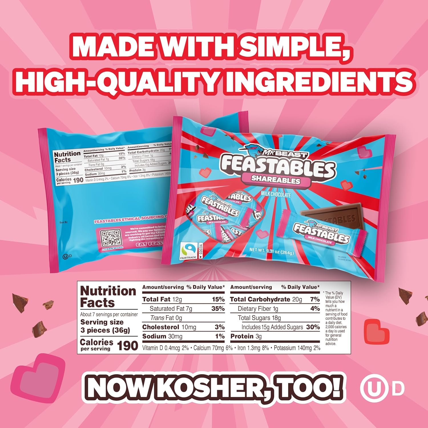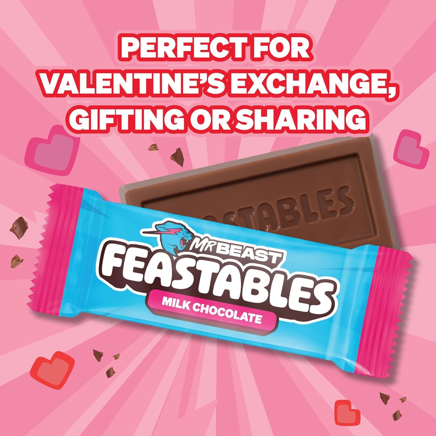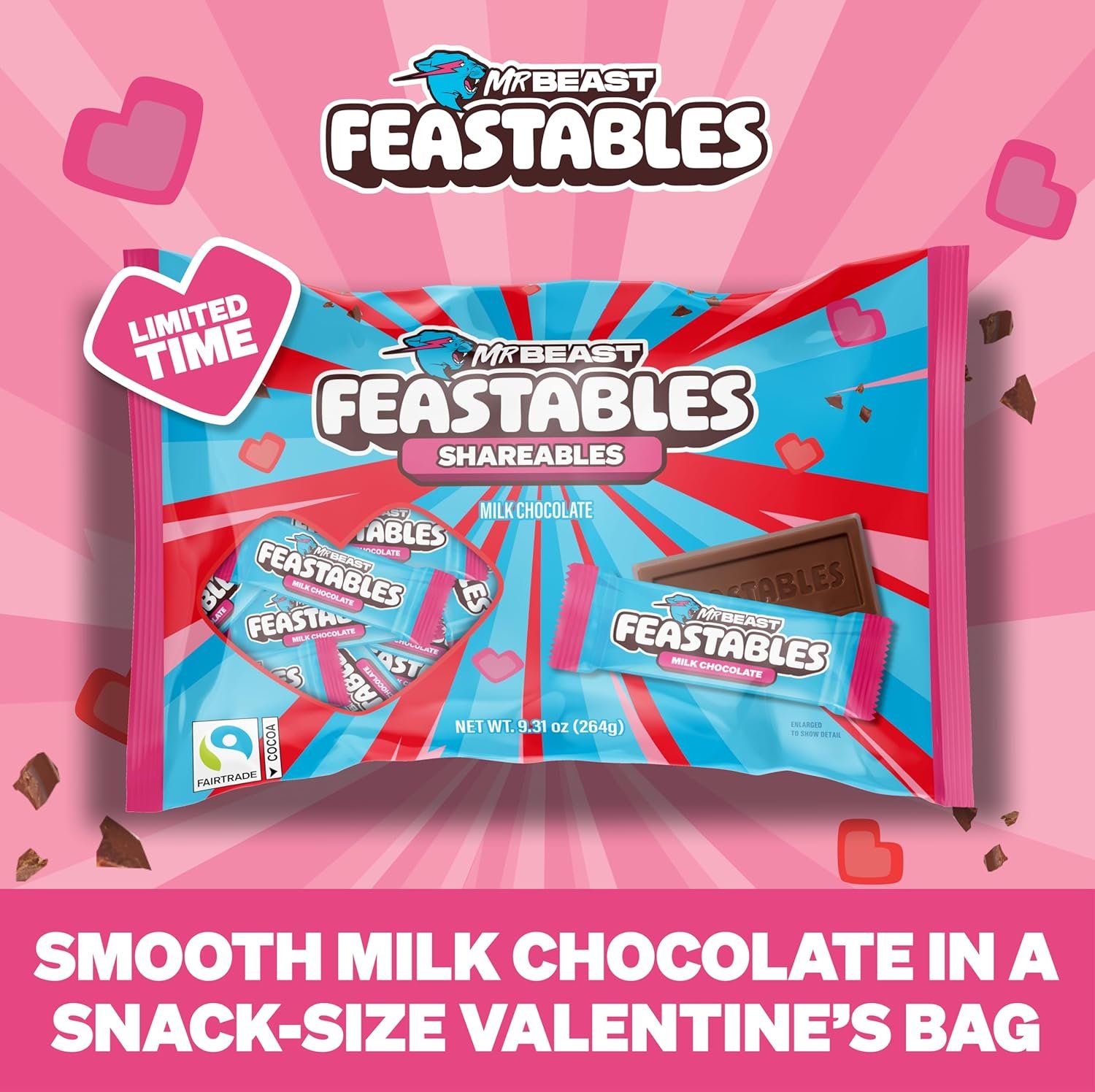 Celebrate Valentine’s Day with MrBeast Feastables Milk Chocolate Mini Bars, a limited-edition assortment of snack-size chocolates made for sharing the love. Featuring smooth, creamy milk chocolate crafted with high-quality ingredients and Fairtrade Certified cocoa, these 12g mini bars are perfectly portioned for classroom exchanges, party favors, gift bags, and seasonal snacking. Designed for kids and adults alike, this festive 22-count pack makes it easy to spread sweetness while choosing chocolate made with responsibly sourced cocoa and thoughtfully selected ingredients.