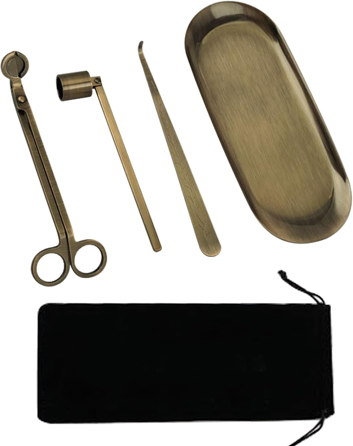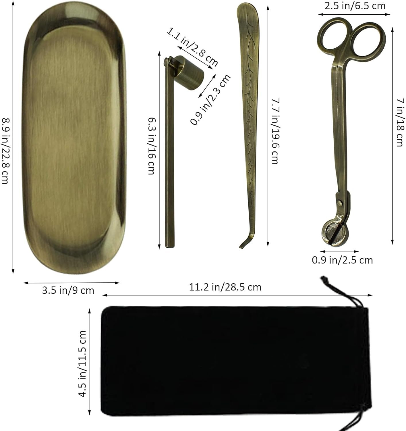 Package Including: 1x Candle Trimmer, 1x Candle Wick Snuffer, 1x Candle Wick Dipper, 1x Storage Tray, 1x Velvet Pouch