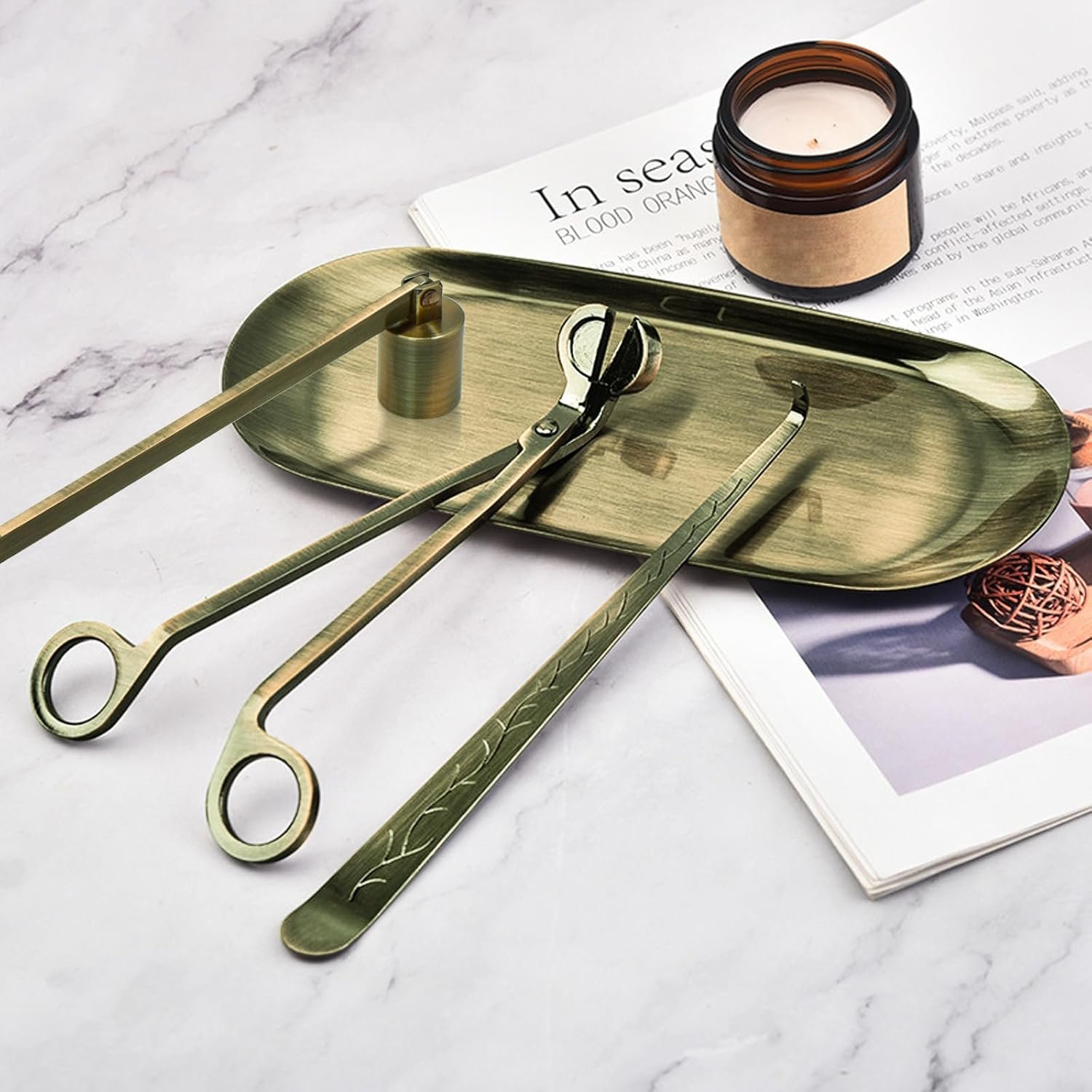 Candle Tools Size: Wick trimmer: 7 x 2.5 inches. Wick snuffer: 7.4 x 0.9 inches. Wick dipper: 7.7 inches. Candle tray: 8.9 x 3.5 inches