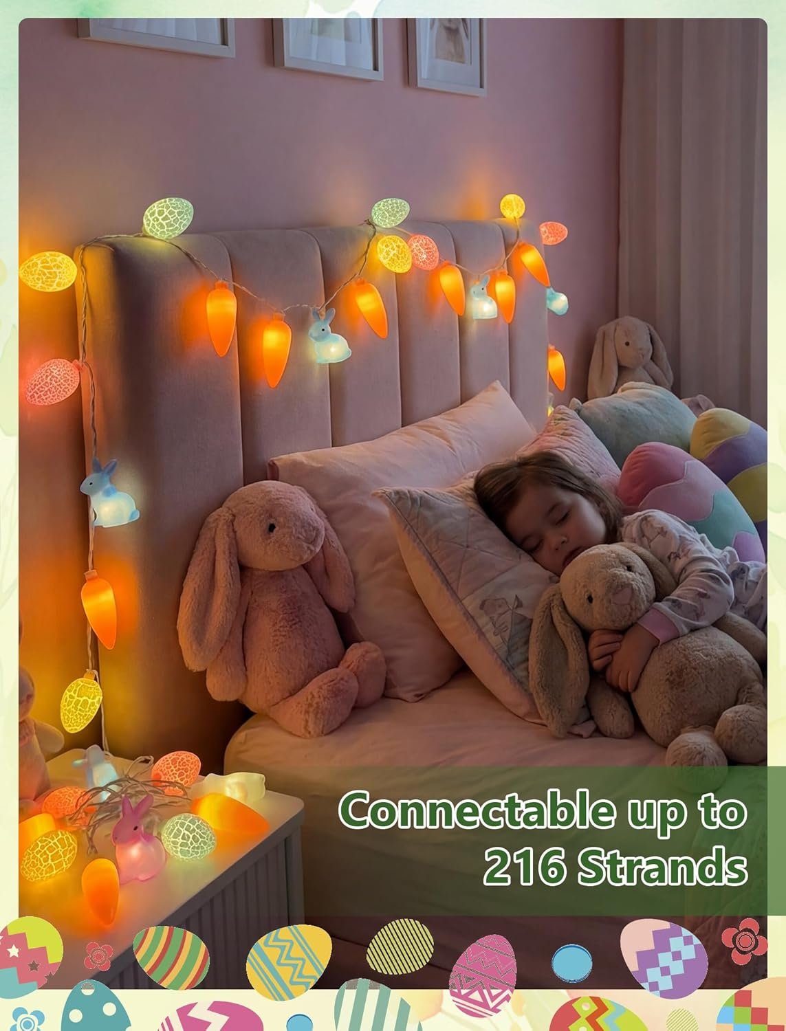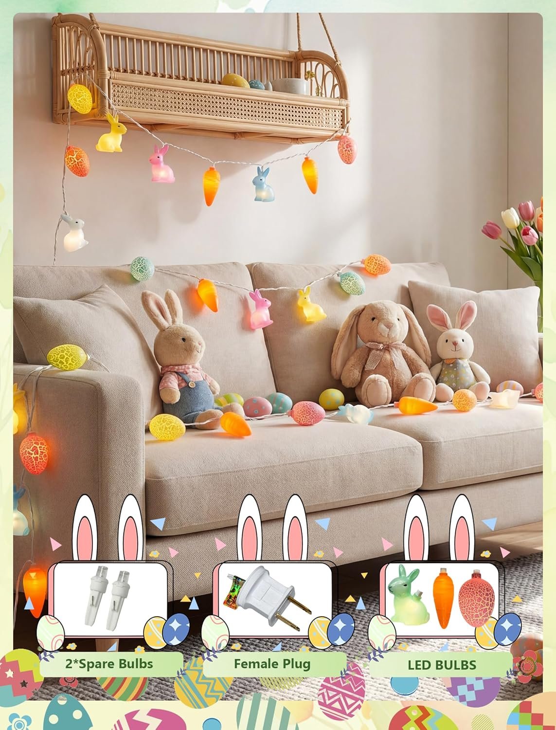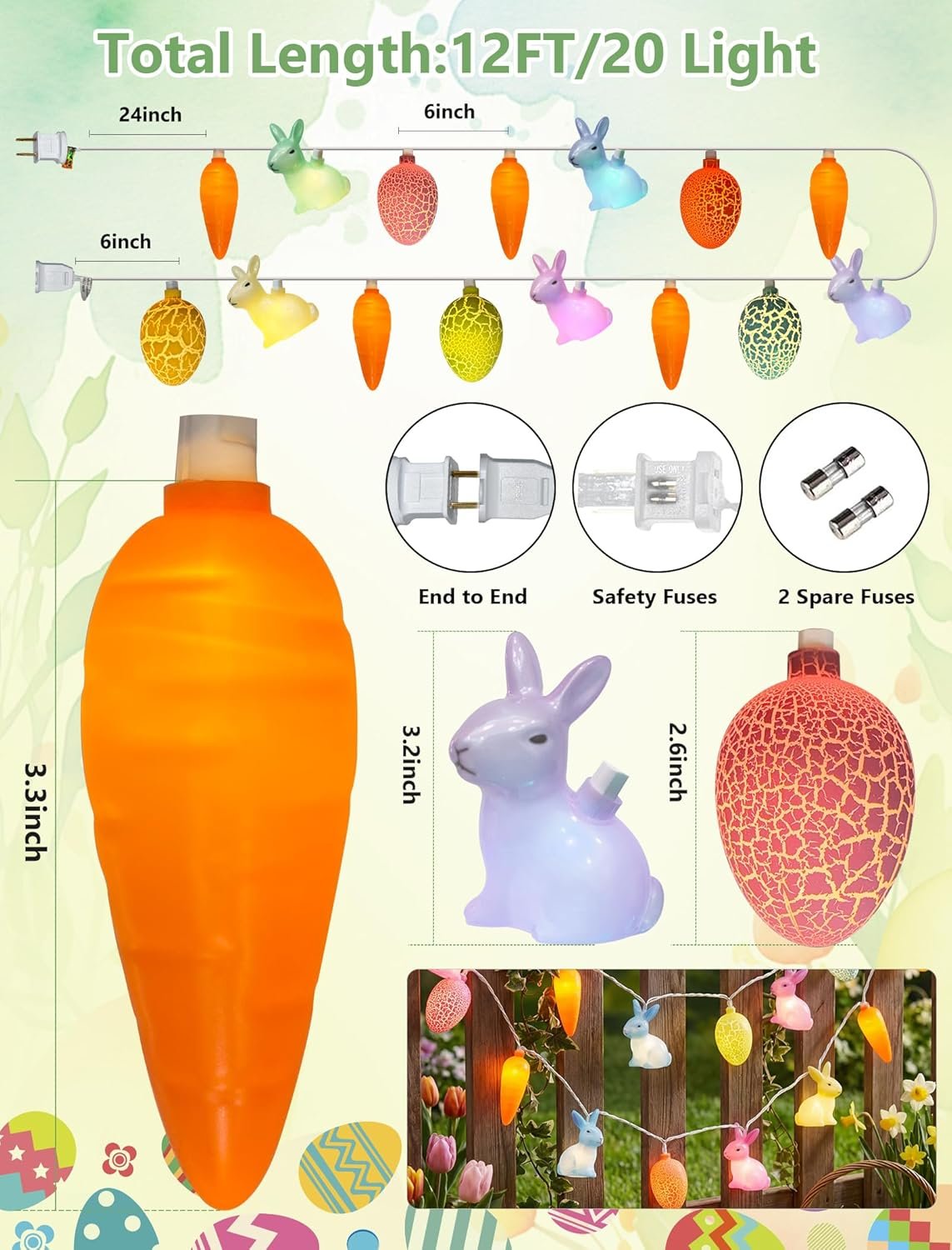 šŸ„•End-to-End Connectable Easter Decorative Light String: Utilize dual connection modes (male/female plug or male/male plug) to link up to 216 strands. This 12ft Easter light string includes a lead with male plug, space 4 inch, plug leading length 24 inch, femal connector leading length 4 inch