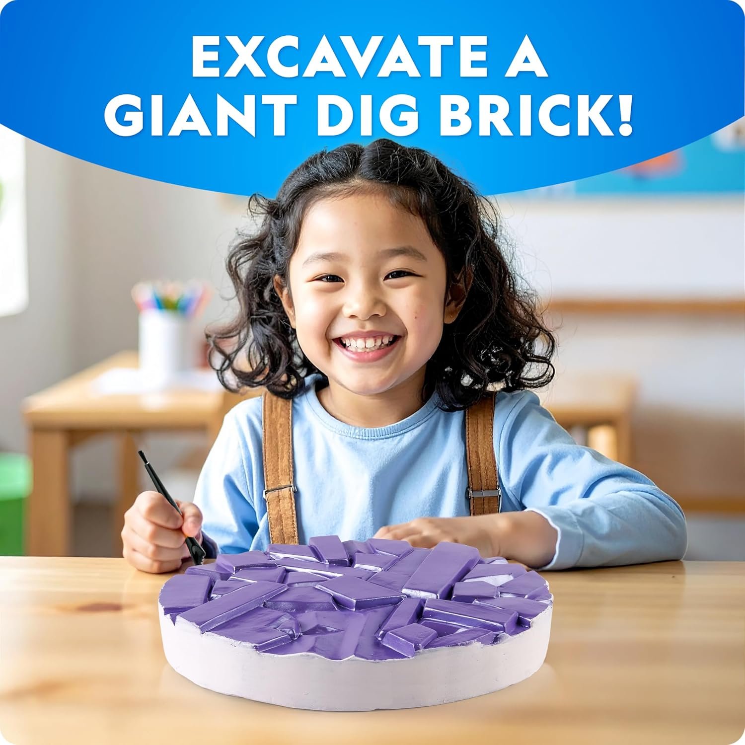 EXCAVATE 100 REAL GEMSTONES – This giant dig brick is packed with 100 genuine gemstones from around the world! Kids can dig out stunning specimens including amethyst, tiger’s eye, quartz, and more.