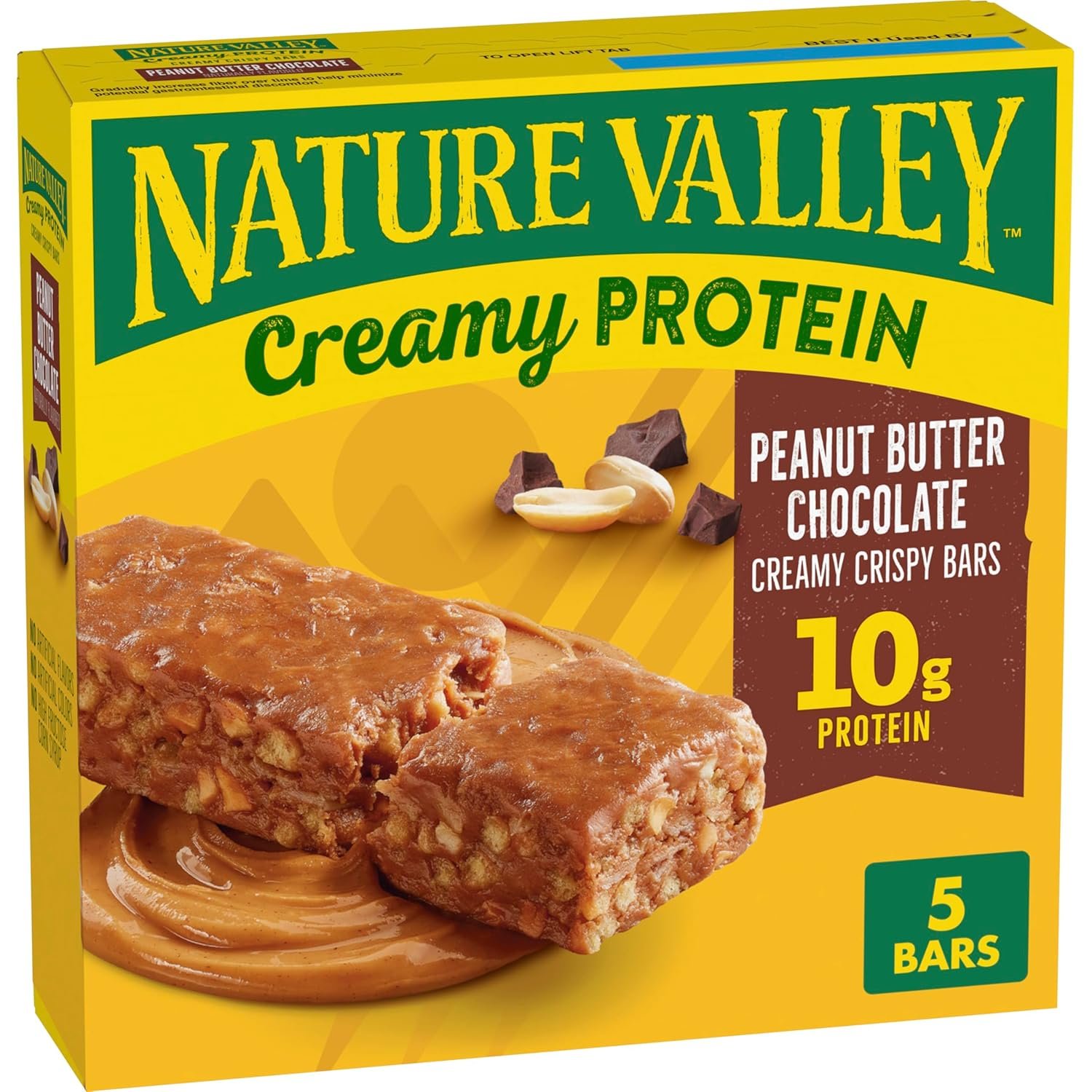 CONTAINS: One regular cardboard box of Nature Valley Creamy Protein Bars, Peanut Butter Chocolate, 5 Bars, 7.45 oz; Perfect for instant snacking