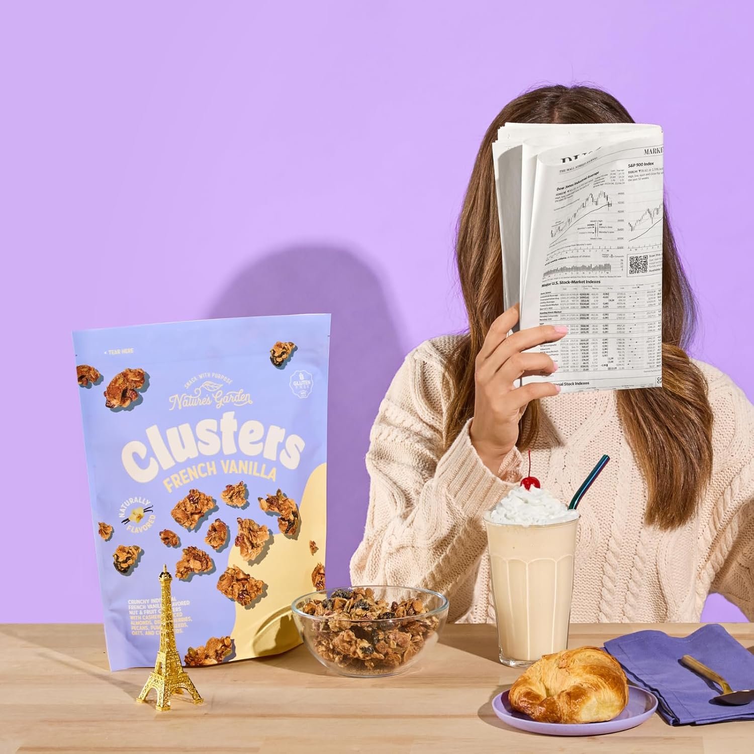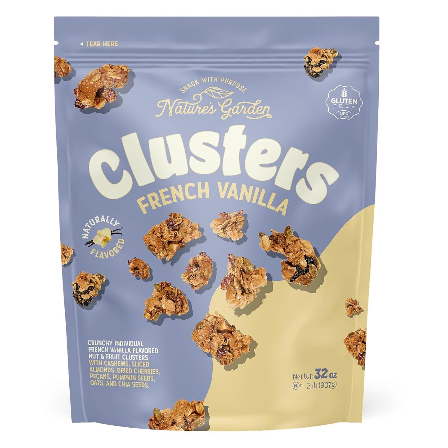 Parisian cafés may be far away, but indulgence is within reach. Nature’s Garden French Vanilla Clusters bring together golden-baked nuts, seeds, and cherries with a hint of natural vanilla for a taste that feels indulgent yet nutritionally responsible. Made with cashews, almonds, dried cherries, pecans, pumpkin seeds, oats, chia seeds, and naturally French vanilla flavored, these oversized clusters are perfect for coffee escapes, study breaks, or a guilt-free indulgent treat. Great to scatter over yogurt or ice cream, pair with milk, or enjoy straight from the pouch when you need a quick refuel. Designed for busy mornings, cozy afternoons, or family adventures, these clusters are versatile enough for every snacking occasion. Housed in a generous 32oz resealable, recyclable pouches, they’re convenient, eco-friendly, and always ready when snack time calls. Naturally flavored, nutrient-packed, gluten-free, non-GMO, and endlessly versatile for straight-from-bag-munching—these Clusters do what granola could never.
