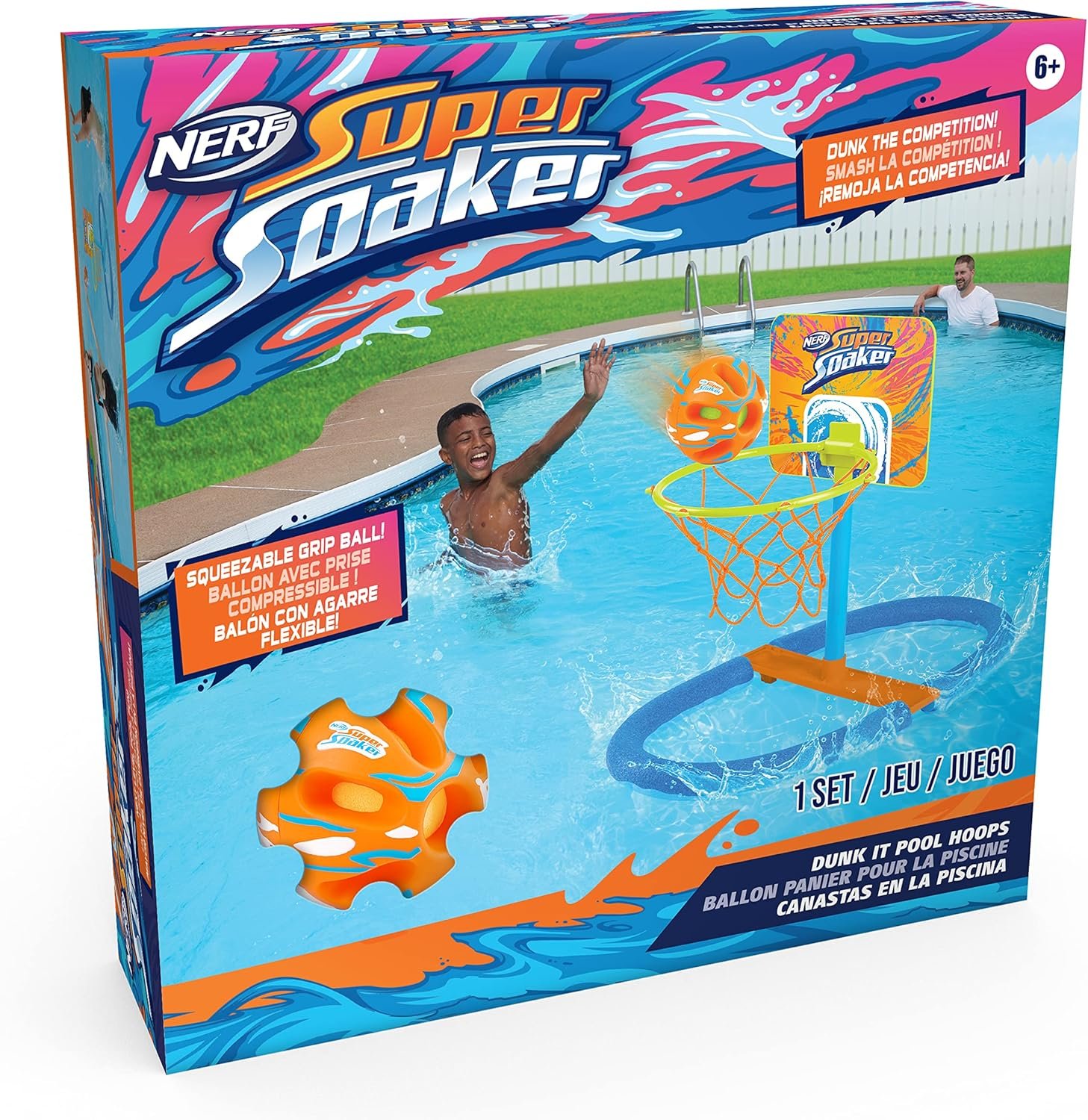 POUR IT ON YOUR COMPETITION. The Nerf Super Soaker Dunk It Pool Hoop is a great way to engage in fun and friendly competition. Take your game from the court to the pool and see how your skills translate in the water. For ages 6 and up.