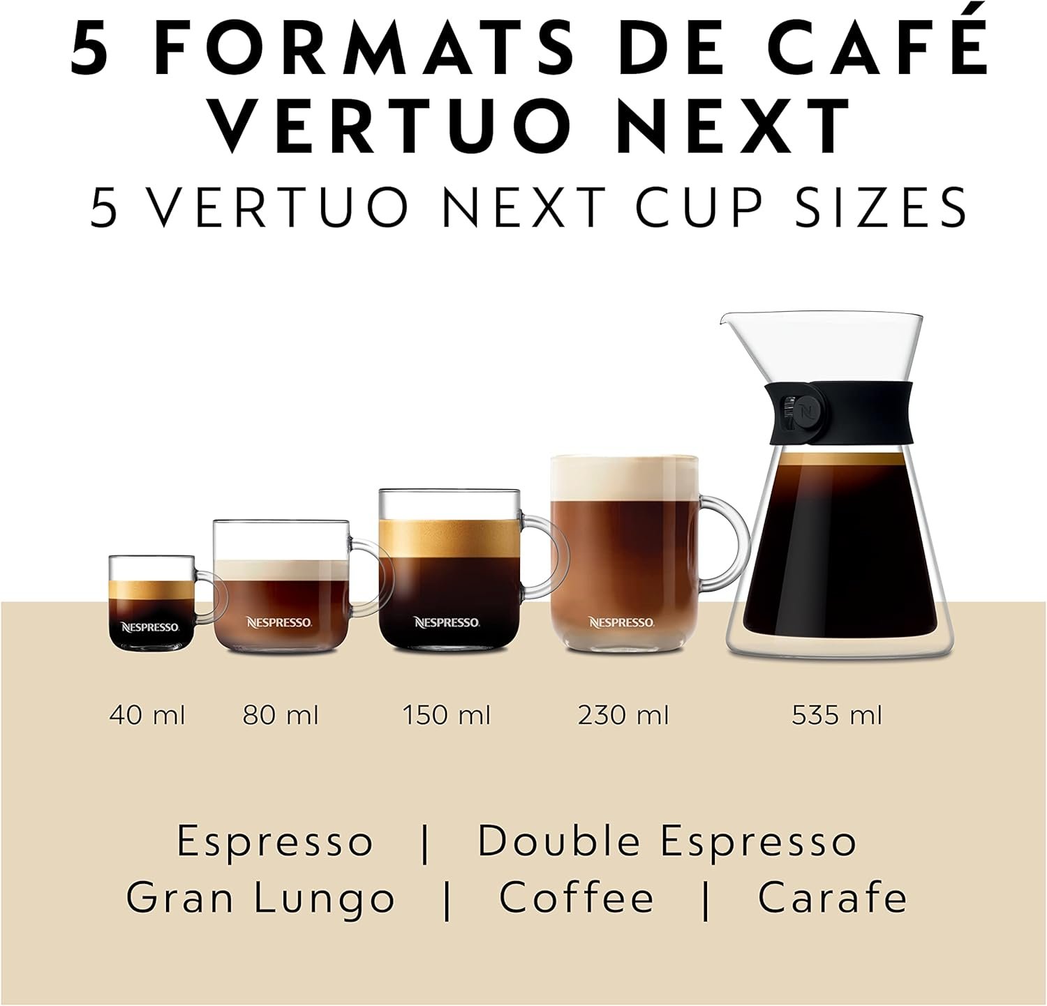 The next big cup is here with Nespresso Vertuo Next. Vertuo Next takes the full range of Nespresso coffee styles even further. Choose your height among five different coffee cup sizes, from Espresso cups to Carafe Pour-Over Style. The coffee machine reads the code integrated in each recyclable coffee pod to offer you its hidden treasures at the touch of a button. The aromas, the flavours and most importantly, the crema. Vertuo Next will go to many lengths to please you, with its multiple colours and metal touches. It updates itself automatically to constantly offer you a seamless experience. Taking today’s coffee experience to the next level.