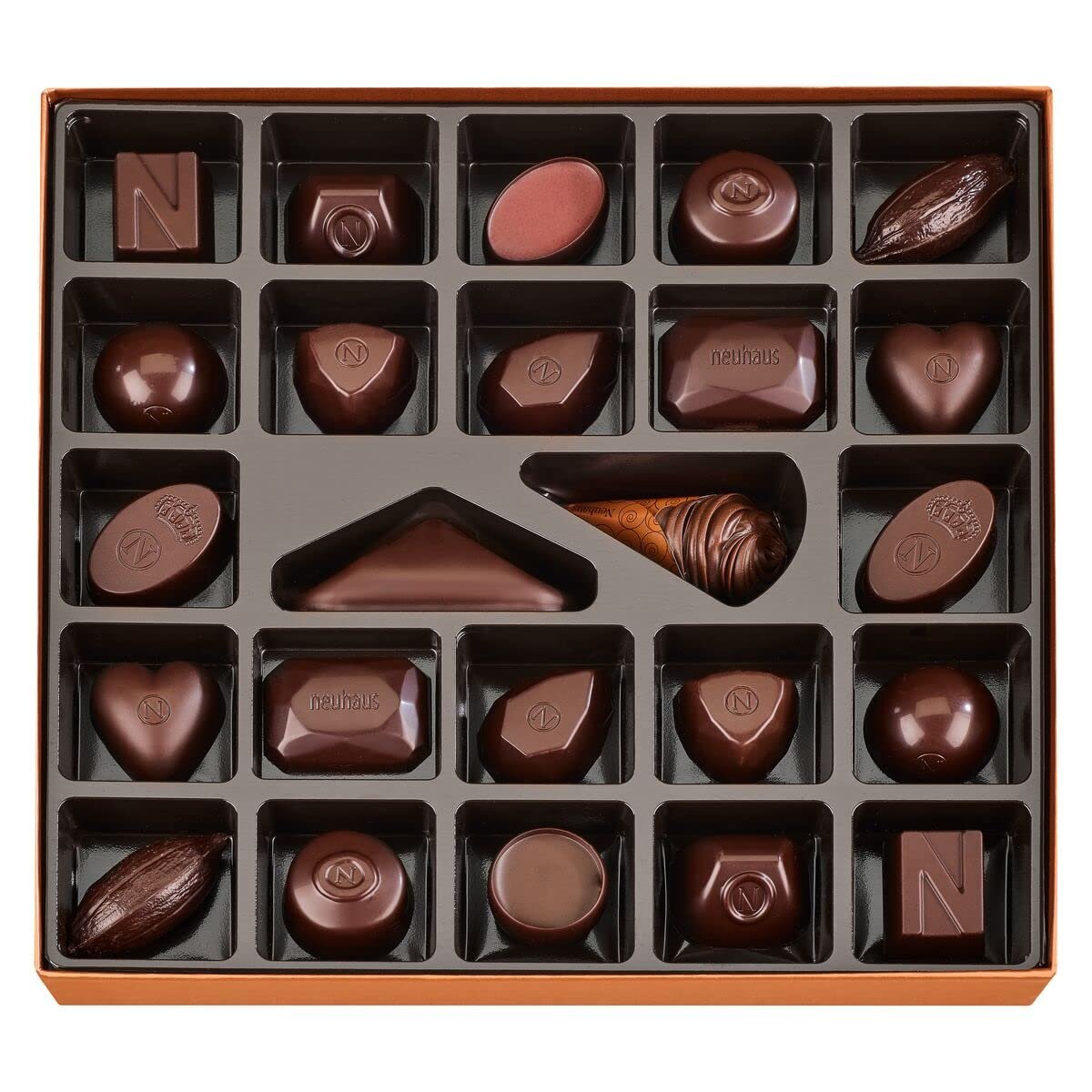 The Neuhaus Collection Discovery All Dark Box contains a selection of 24 timeless Intense Dark Coated Neuhaus filled chocolates. A contemporary and elegant gift box hand-filled with pralinés, ganaches and caramels