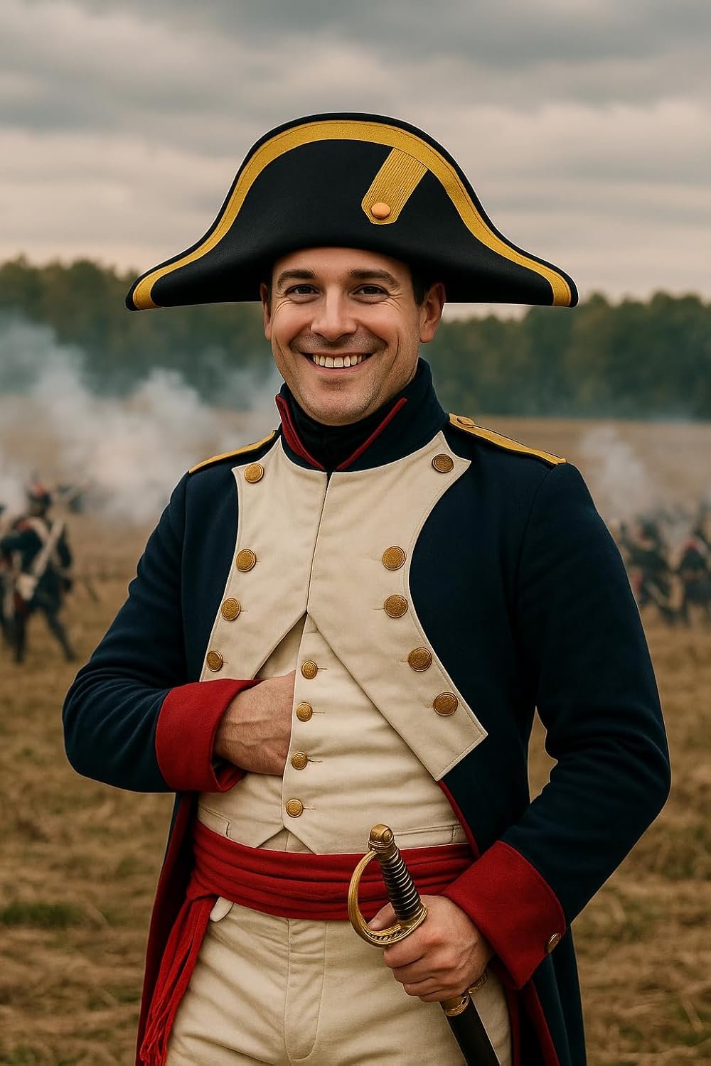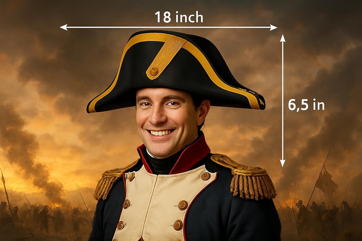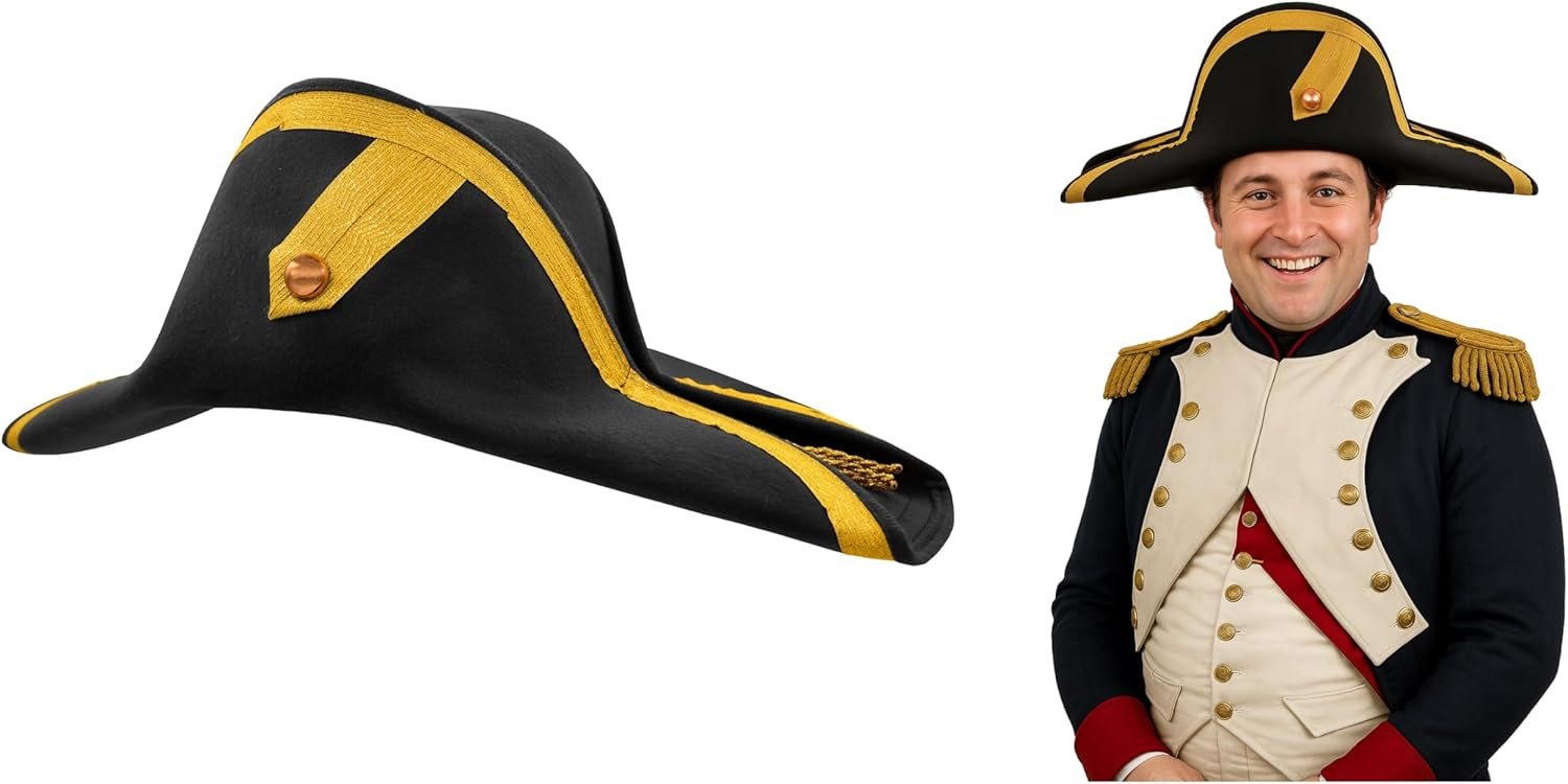 This season complete your Napolean Or Pirate costume with this Deluxe style Admiral Hat. Select from Black or Brown colonial bicorn hat. Each bi-corn hat is features a gold braid trim, copper button, and frill. Great for Men, Women, and teens. This captain hat perfect for reenactments of the late 1700’s- early 1800’s. The Bonaparte hat is sized approximately 59 cm and stands about 6.5 inches tall. From side to side, the pirate hat measures about 18 inches long. Great for Napoleon, French Military, Pirates, and More. Each revolutionary hat is made of felt. Spot clean only. For ages 14 and older.
