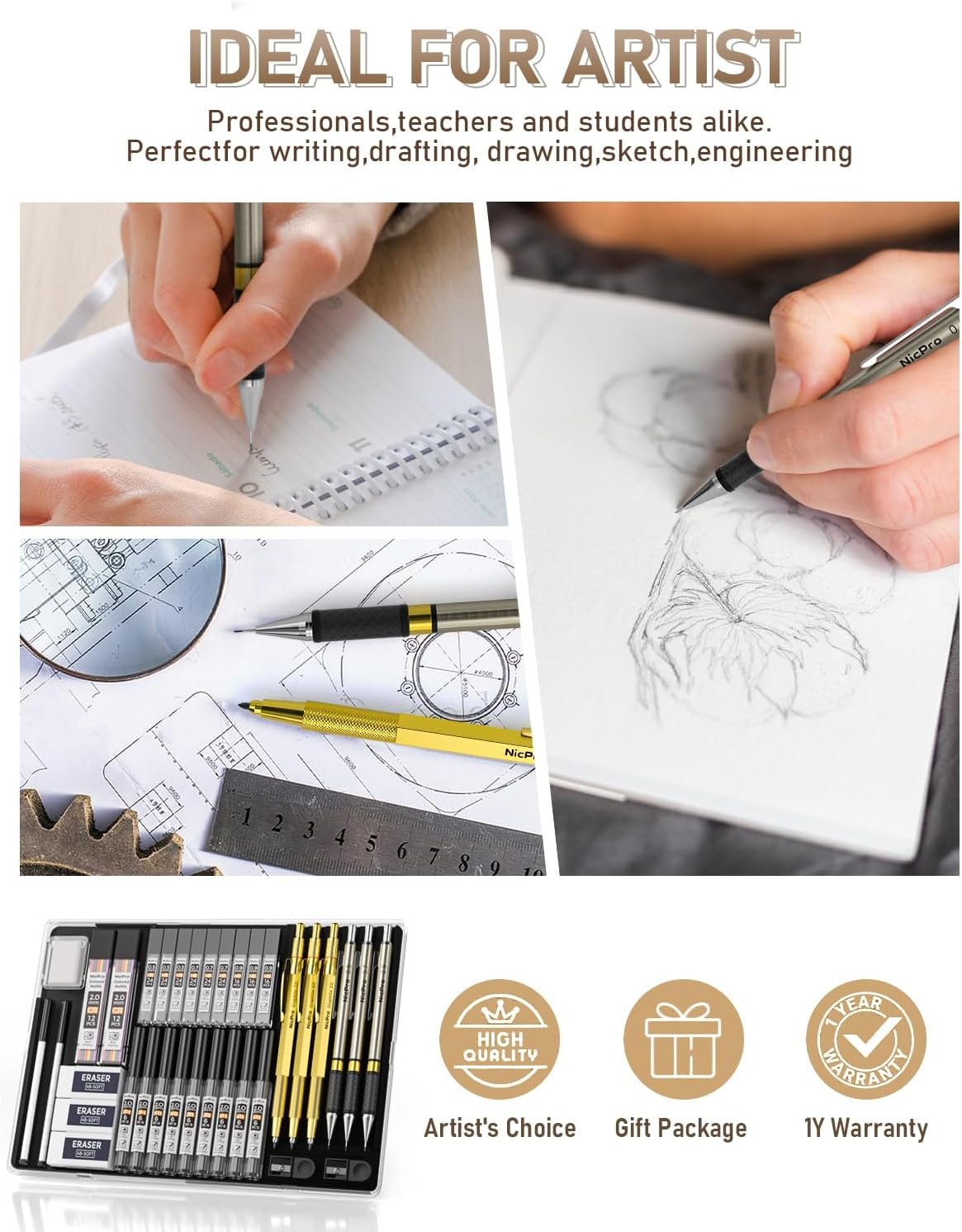 3 Kinds of Erasers :Nicpro Latex-Free 4B erasers,remove pencil marks without damaging the paper no smudges,no ghosting,and won’t crack or harden with age, remains soft and ready to use. The kneaded eraser can easily molds into the shape & size you like, perfect for correcting and lightening charcoal, pencil, and pastel