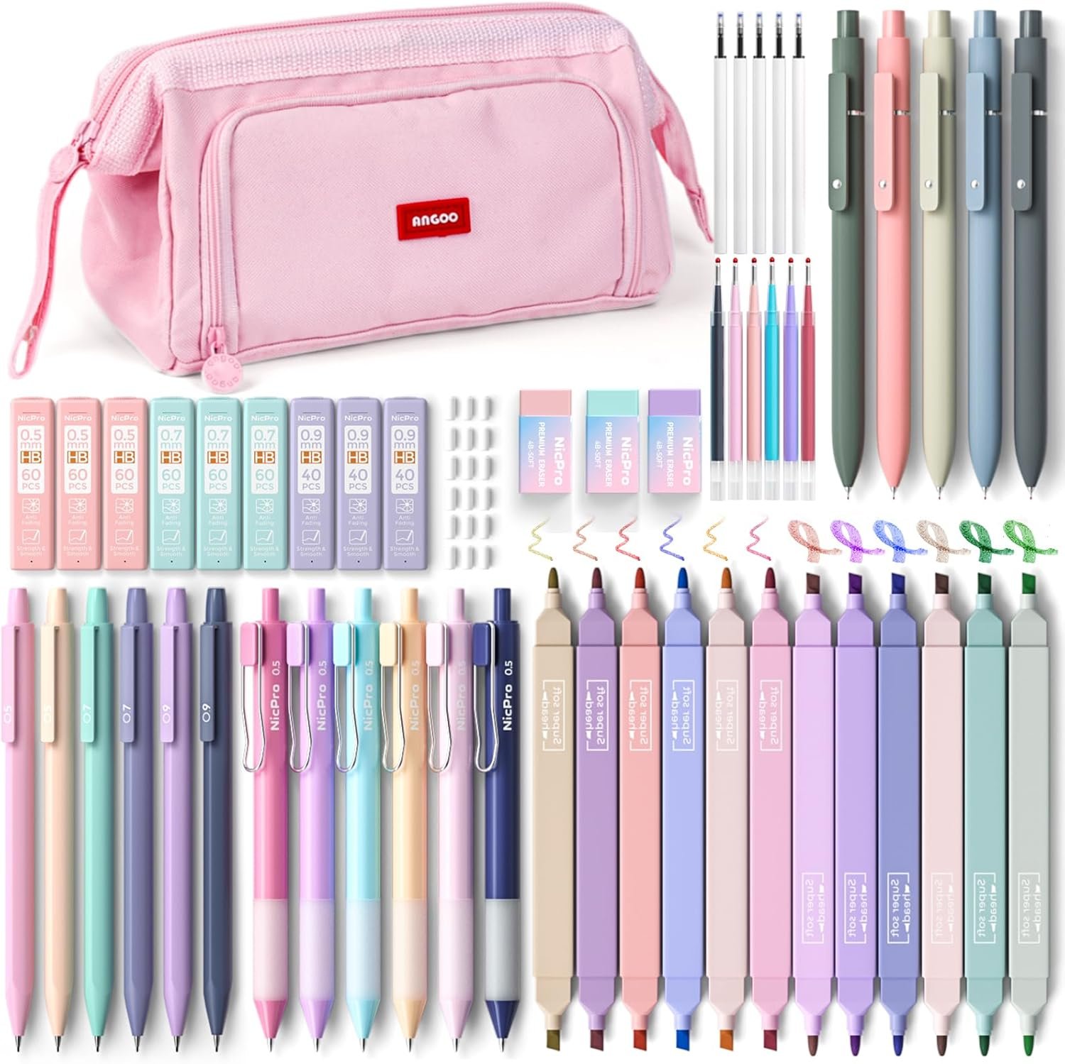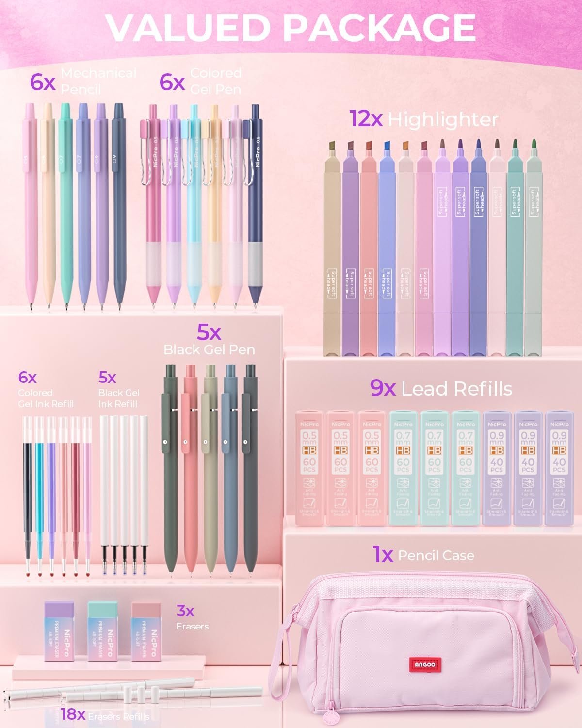 All-in-One Stationery Set:This comprehensive set includes 12 highlighters, 5 black ink gel pens and pen refills, 6 colored gel pens and pen refills, 6 mechanical pencils (0.5, 0.7, 0.9 mm), 9 tubes lead refills, 3 erasers, 18 eraser refills and 1 pink pencil case—everything you need for writing, highlighting, and organizing your study materials. It’s a must-have for all your stationary needs.