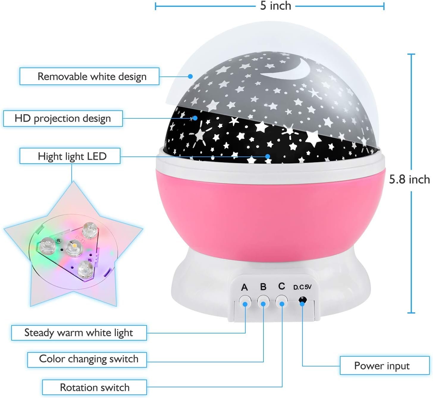 9 kinds of dreamy color modes: 4 LED beads warm yellow, blue, red and green and multicolored with 9 different light modes. The base rotates quietly, and spreads the colorful universe. Find your own constellation sign