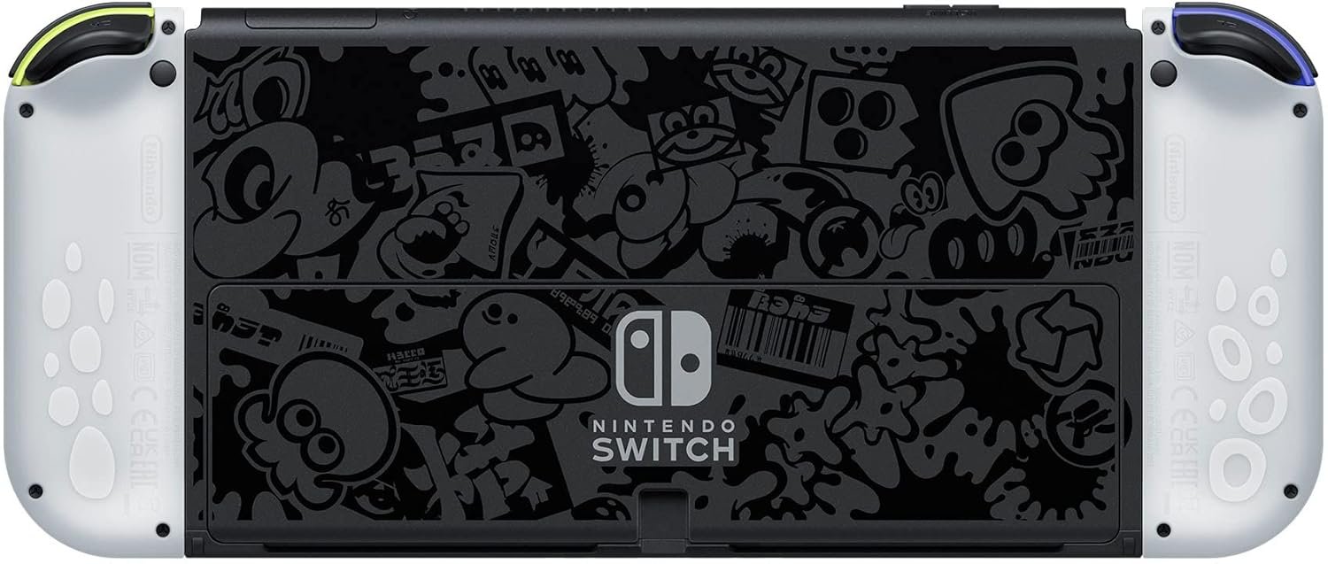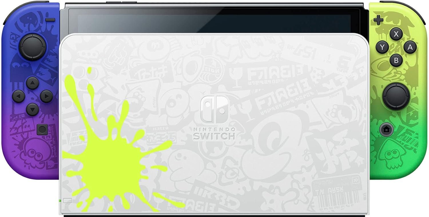 This Nintendo Switch™ system takes on a totally fresh look from the new Splatoon™ 3 game Ink up the Splatlands in style with this Splatoon themed Nintendo Switch – OLED Model system! Fresh features include; blue and yellow gradient Joy-Con™ controllers with a white underbelly, a white dock adorned with graffiti, and a splat-tastic design on the back of the system. Featuring: • 7-inch OLED screen – Enjoy vivid colors and crisp contrast with a screen that makes colors pop • Wide adjustable stand – Freely angle the system’s wide, adjustable stand for comfortable viewing in Tabletop mode • Wired LAN port – Use the dock’s LAN* port when playing in TV mode for a wired internet connection • 64 GB internal storage – Save games to your system with 64 GB of internal storage (a portion of which is reserved for use by the system) • Enhanced audio – Enjoy enhanced sound from the system’s onboard speakers when playing in Handheld and Tabletop modes • Supports all Joy-Con controllers and Nintendo Switch software** Includes: • Nintendo Switch console • Nintendo Switch dock • Joy-Con (L) • Joy-Con (R) • Joy-Con straps • Joy-Con grip • High Speed HDMI Cable • Nintendo Switch AC Adapter Game not included *LAN cable sold separately **There may be software where the game experience may differ due to the new capabilities of the system, such as the larger screen size.