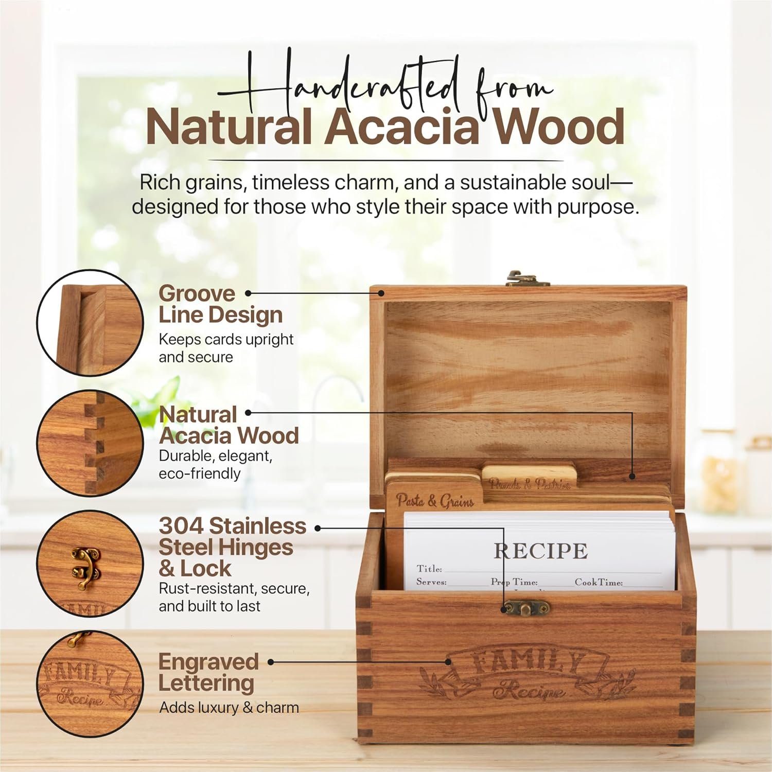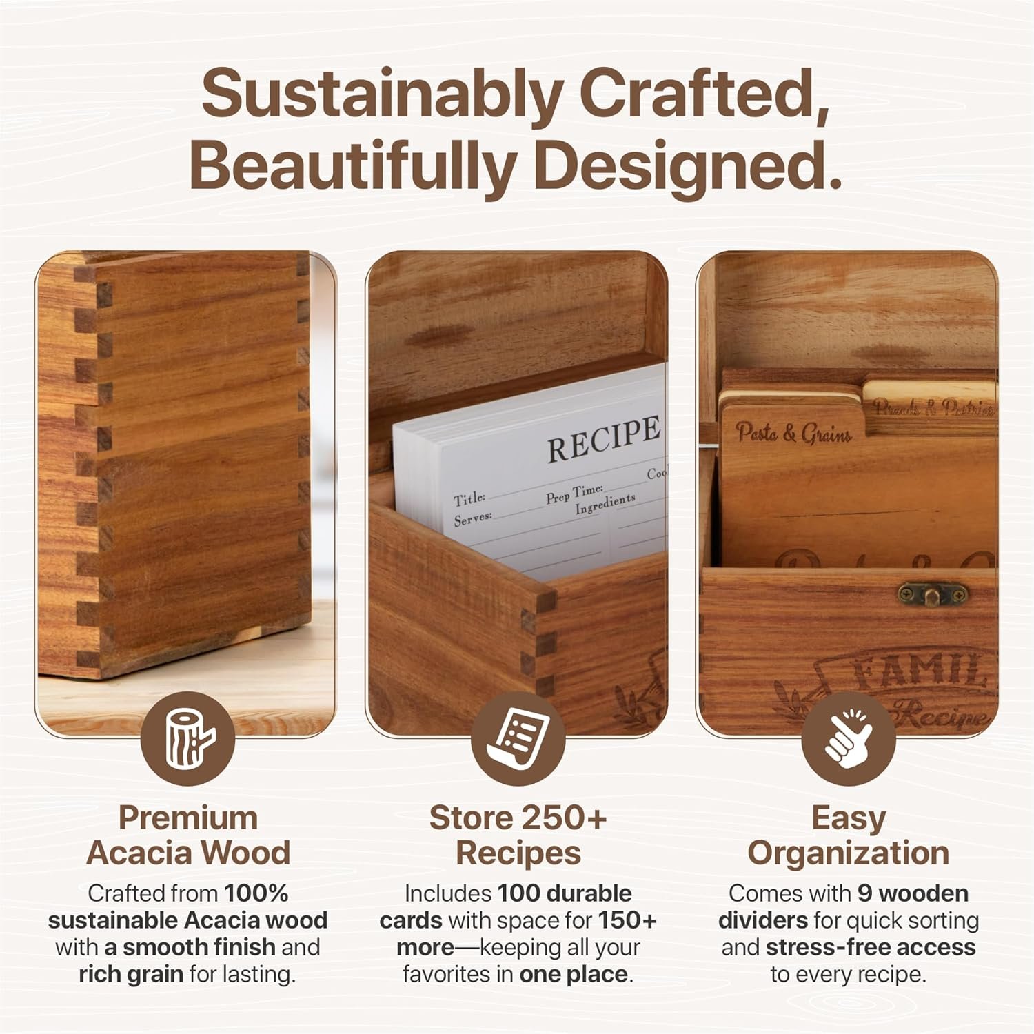 ⚡GET ORGANIZED IN MINUTES, NOT HOURS: You’ll be amazed how quickly you can organize all your recipes! Your recipe box comes ready to use with 9 wooden dividers – just sort your recipes by type and you’re done. No assembly needed, no complicated setup, just simple organization that actually works.