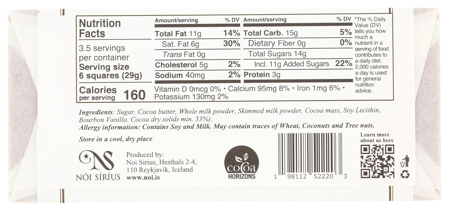 This Icelandic deliciously creamy milk chocolate bar is made with 33% cocoa, giving it a light, sweet flavor with the perfect balance.