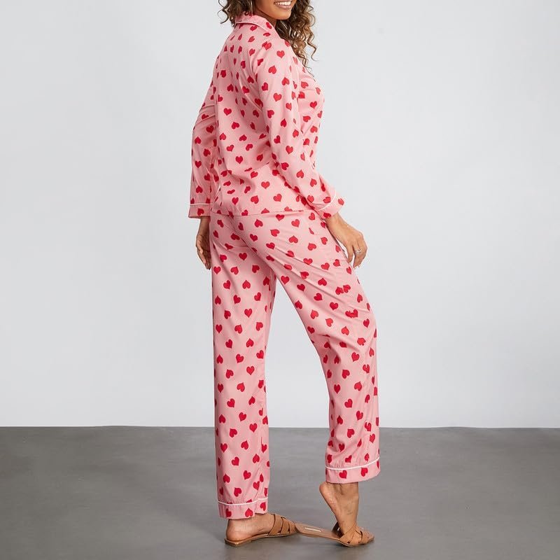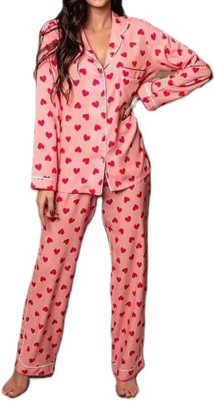 Valentine’s Heart Print 2 Piece Loungewear Set Long Sleeve Button Up Top and Pants Cute Pj Sleepwear Nightwear