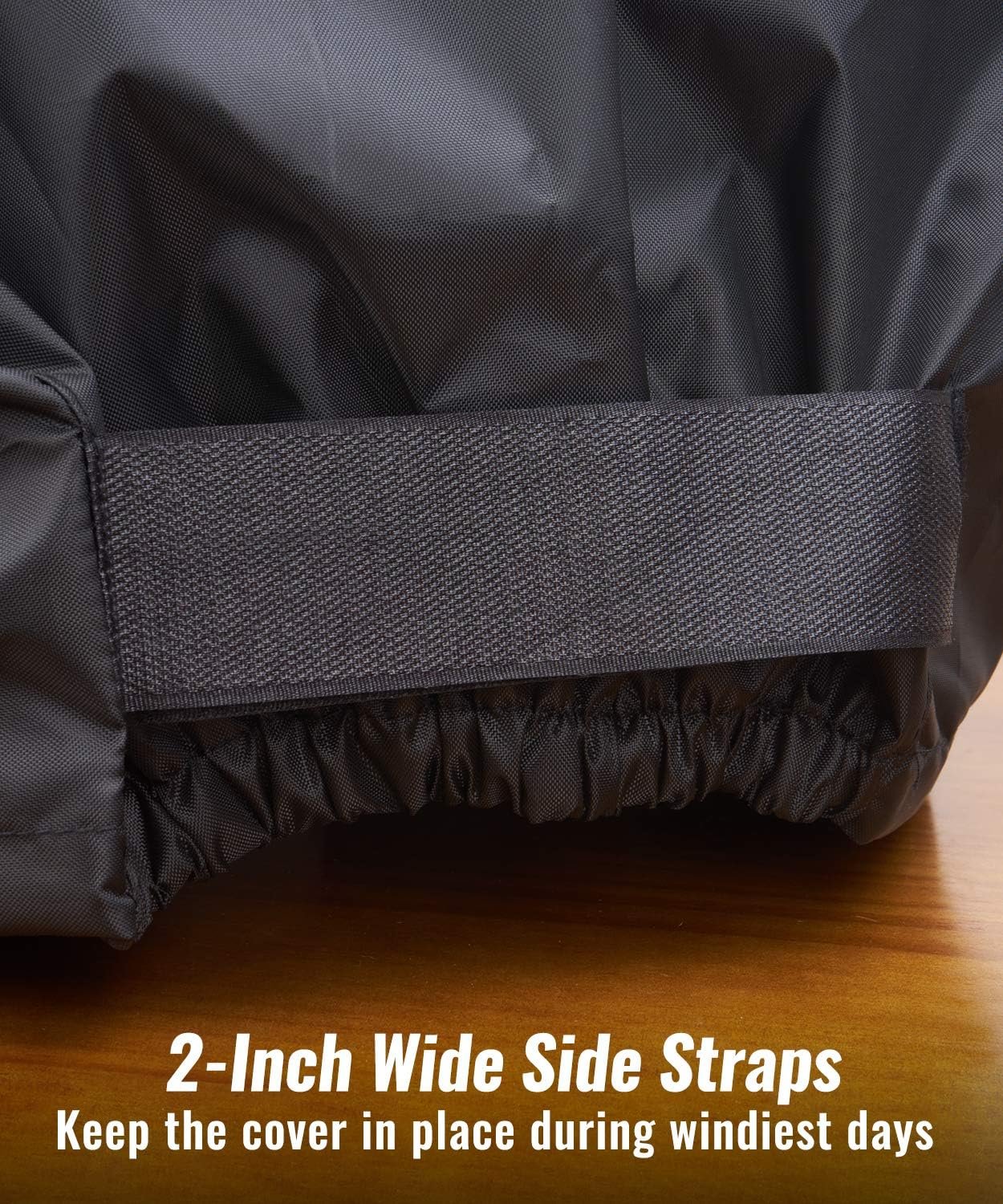 WIND RESISTANT – Elastic strap on each side keep the cover in place in windy conditions and creat as snug a fit around the BBQ as possible