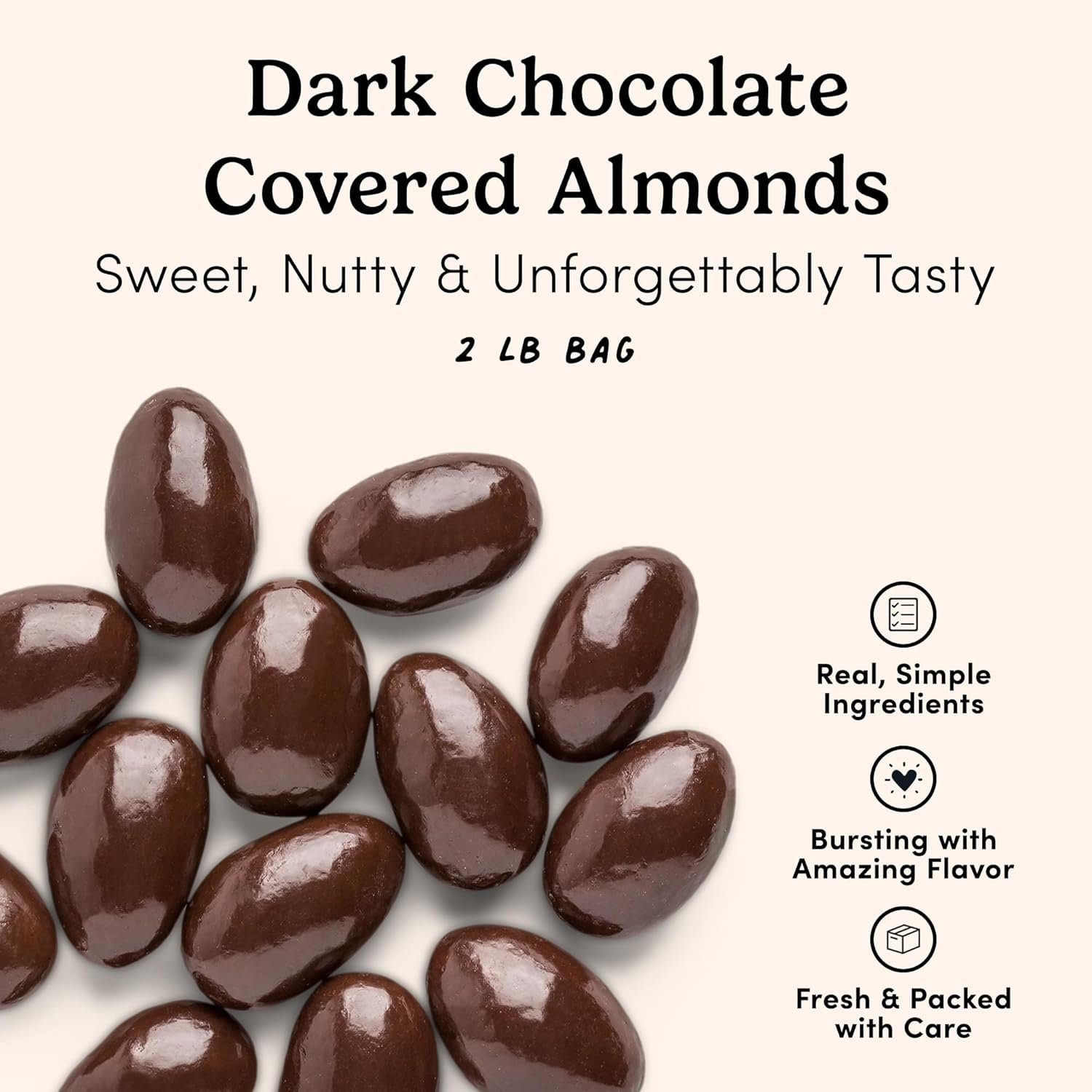 Includes 2 Pounds of Premium Chocolate Covered Almonds: These goodies are prepared in house to ensure maximum freshness and are shipped in a resealable bag; store at room temperature for up to 6 months