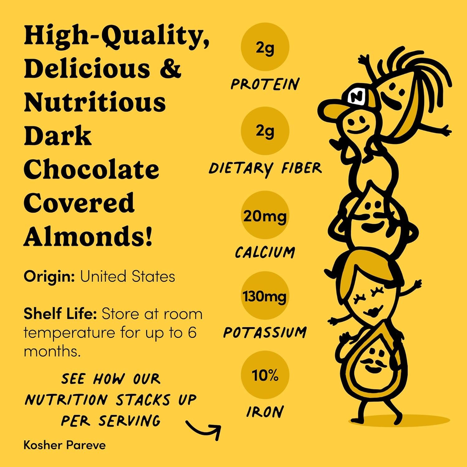 Sweet, Nutty & Unforgettably Tasty: A heavenly matrimony between fine nuts and rich chocolate, our chocolate almonds are made with lush, semi-sweet dark chocolate and whole, dry-roasted almonds
