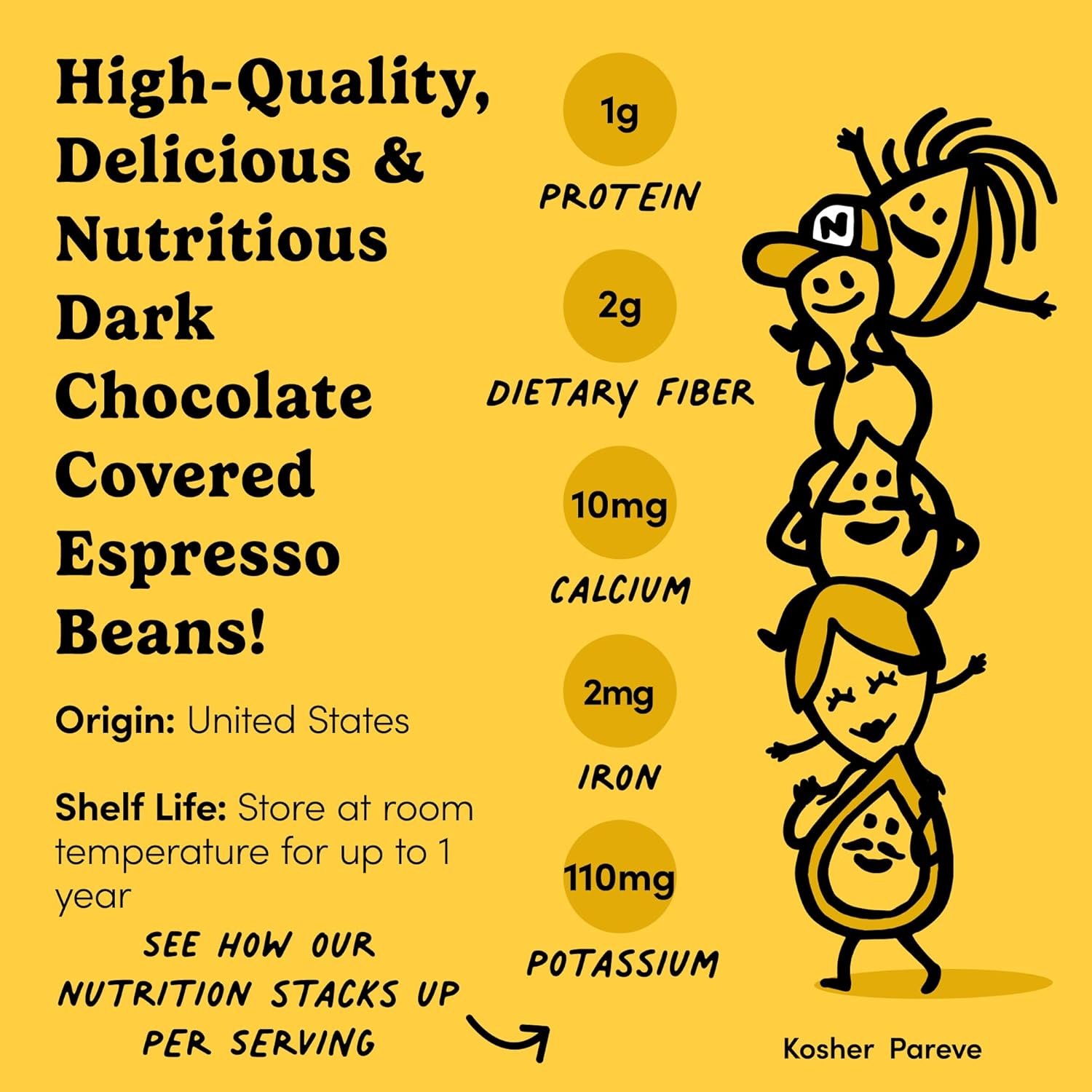 Sweet, Chocolaty and Slightly Bitter: Hand-picked estate Arabica espresso beans coated in rich 60% cacao dark chocolate, adding a balanced flavor to trail mix, cookies, baked goods, or chocolate bark.