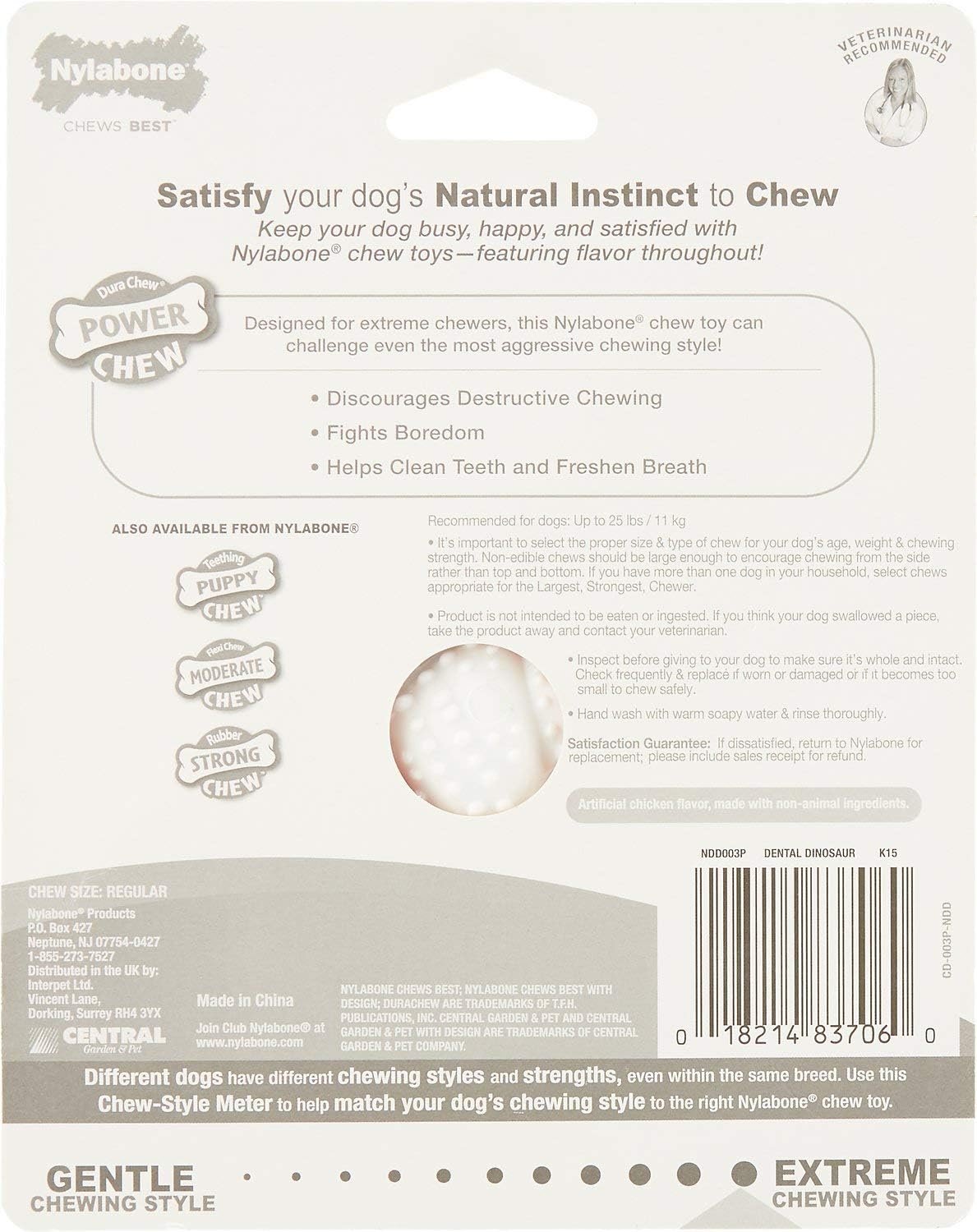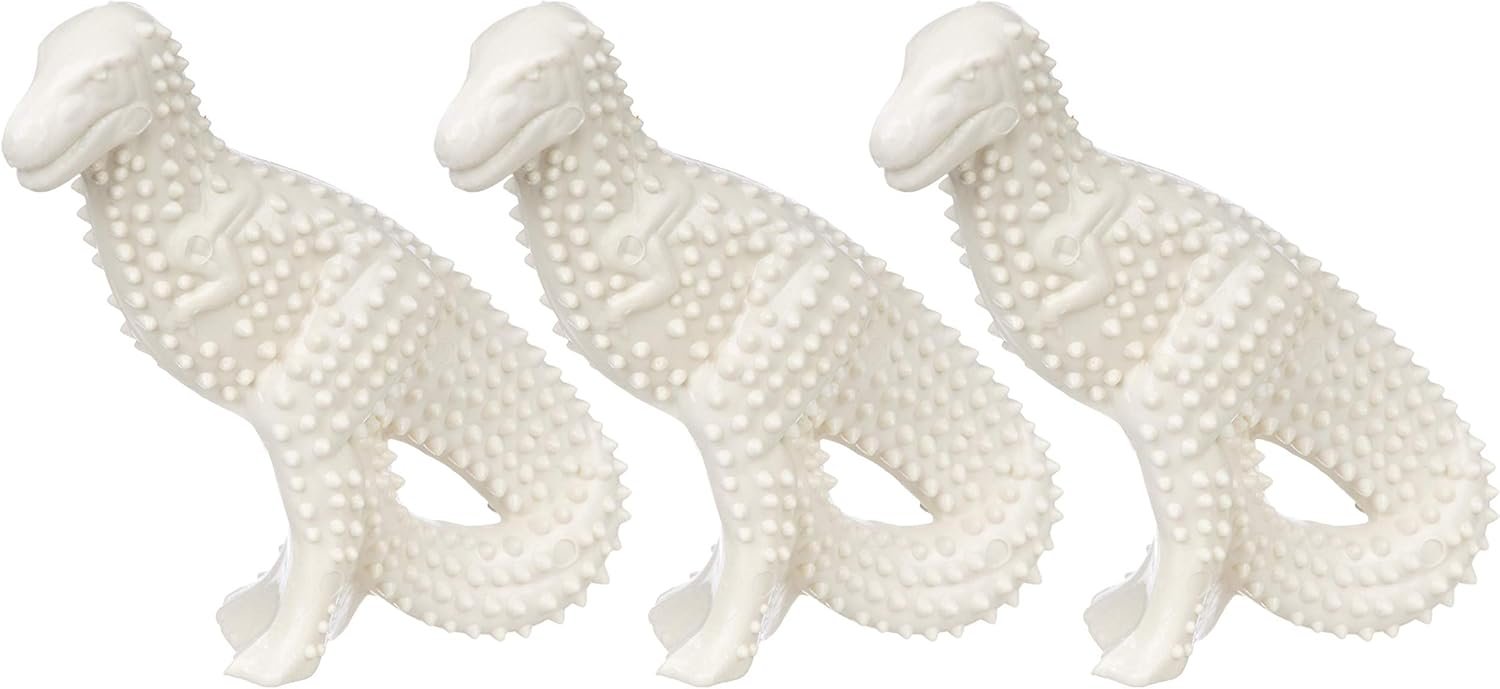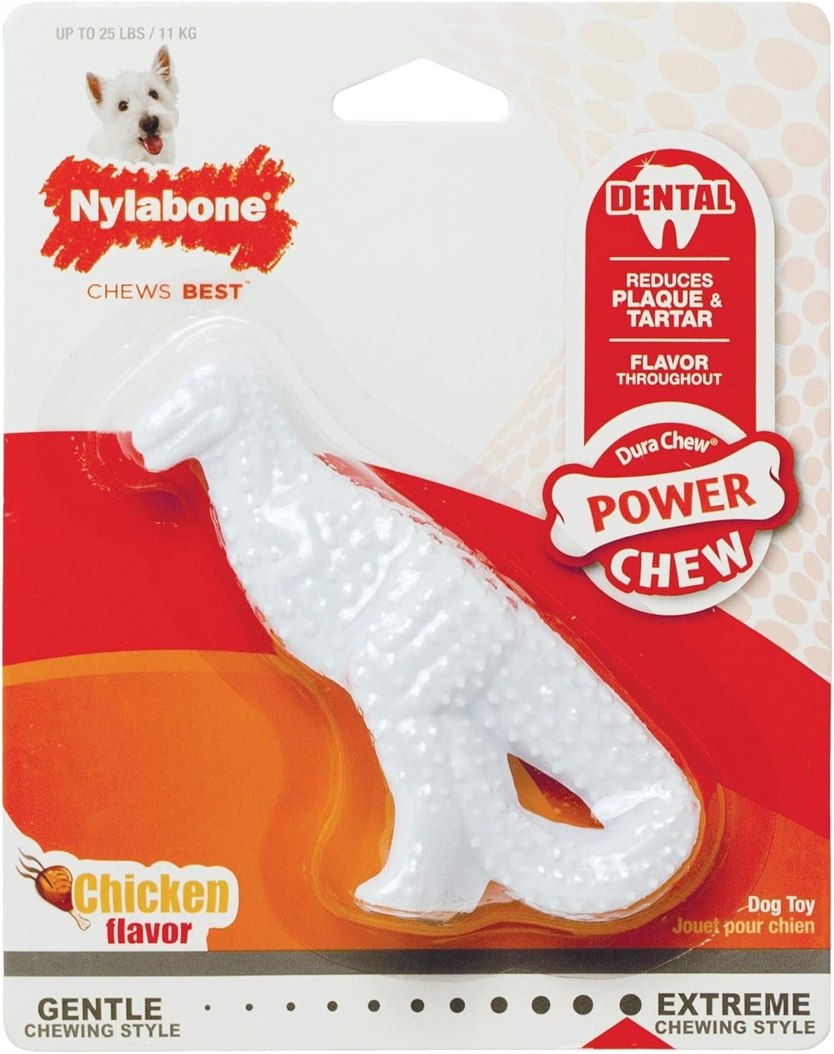 Strong dogs with powerful jaws need durable, powerful chew toys! Our Power Chew Dental Dinosaur will satisfy your dogs urge to chew with a tasty chicken flavor throughout. This chew toy is a dental chew toy for dogs and features rounded nubs and bristles that are gentle yet raise during chewing. For your dog they can promote clean teeth, help to control plaque and tartar buildup, massage gums, and freshen breath.