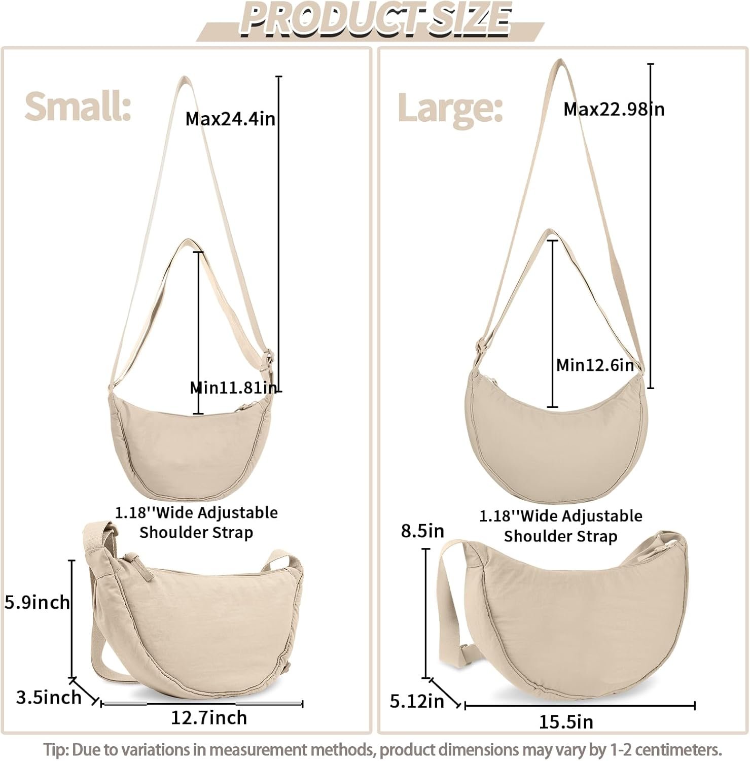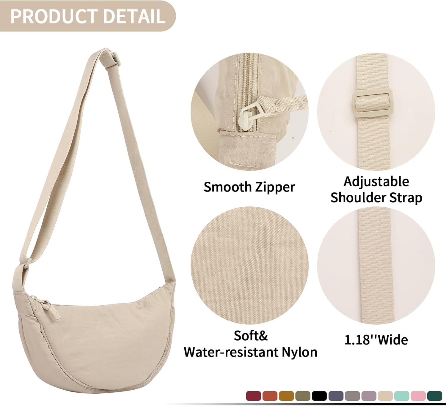 The crescent crossbody bag is made of durable and soft nylon fabric. It is 12” x 3.5” x 6” (L x W x H). The size is small, but it can perfectly accommodate your daily needs such as cell phone, sunscreen, lipstick, keys, umbrella, tissues, etc.The solid-colored crossbody bag has an adjustable shoulder strap and a durable zipper.Whether you are going to work, travel, shopping, dating or to the beach, they are your perfect everyday companion.