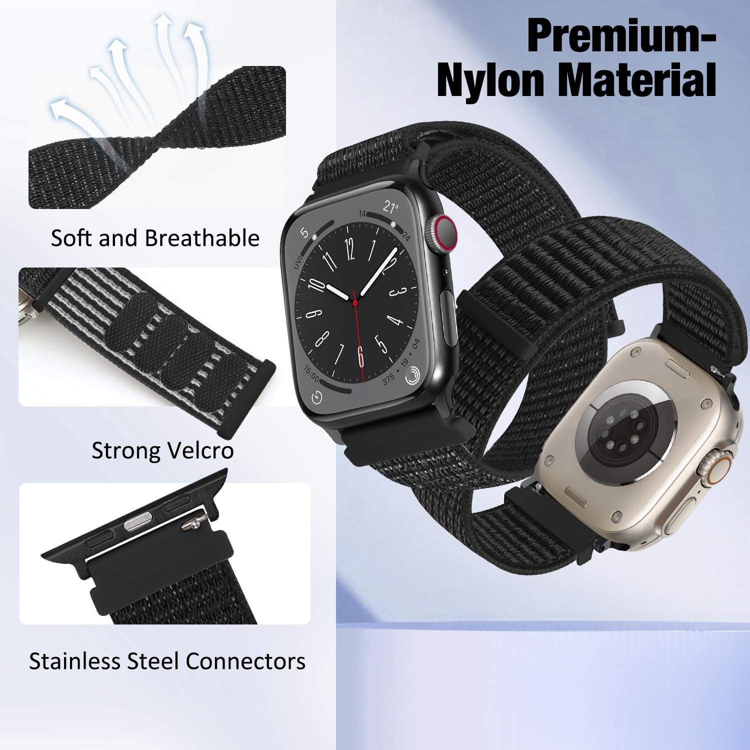 The apple watch bands are made of premium stretchable nylon material. They are durable, soft, skin-friendly and breathable, offering a comfortable wearing experience to you.