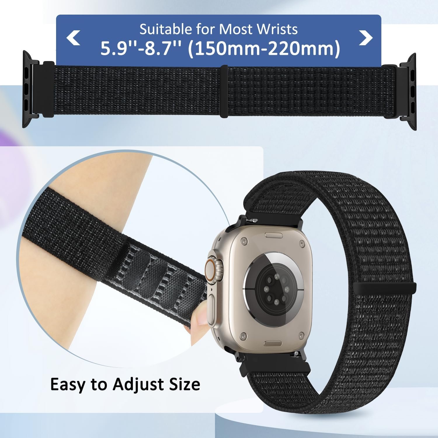 The sport apple watch bands are designed with sturdy hook & loop fastener. You can freely adjust the length to fit your wrist.