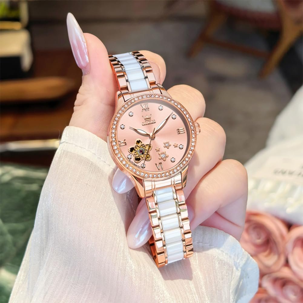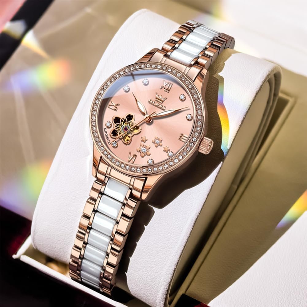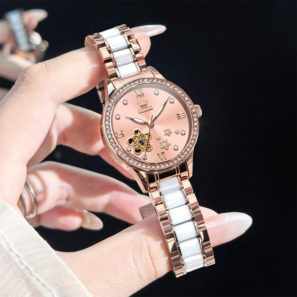 OLEVS Womens Watches Automatic Luxury Dress Ladies watch Ceramic strap Rose Gold Self Winding Female Wrist Watch