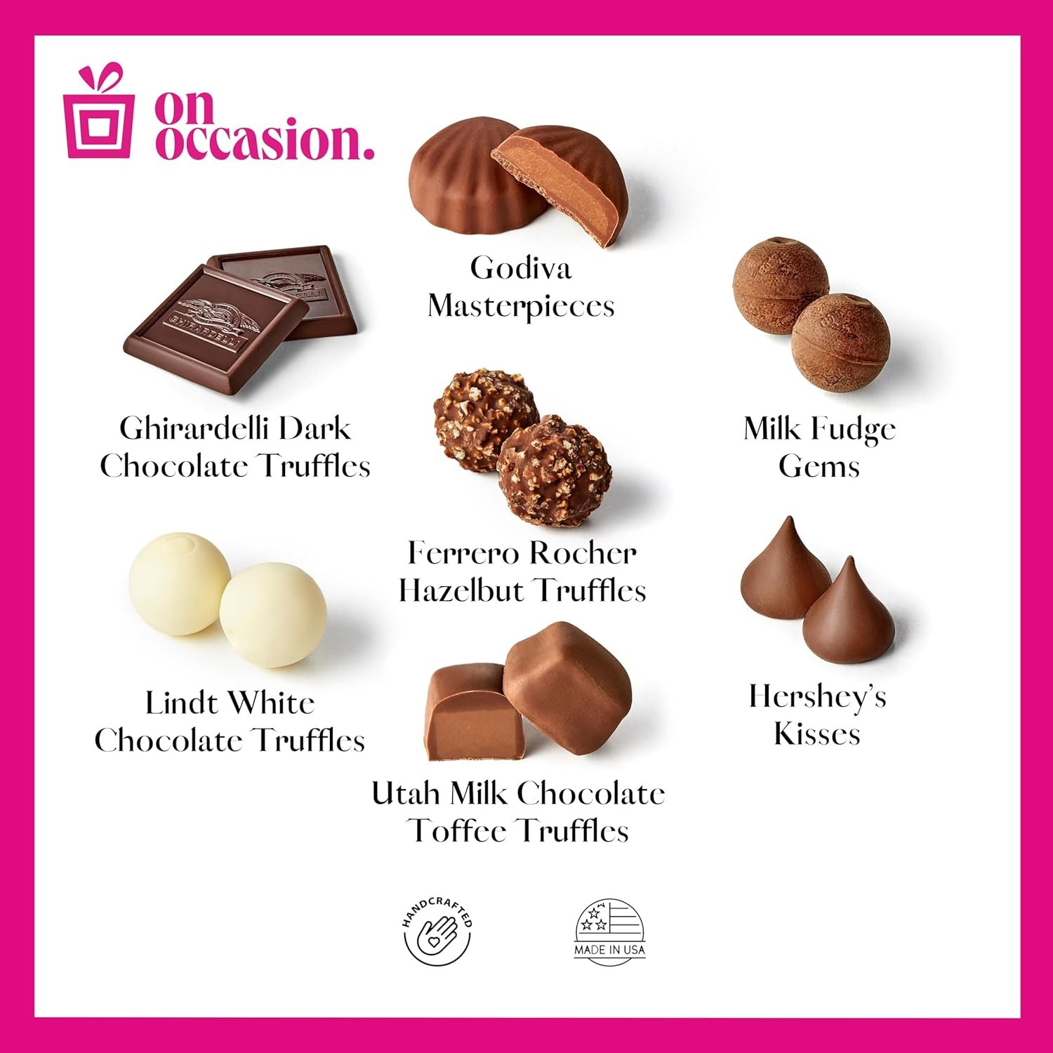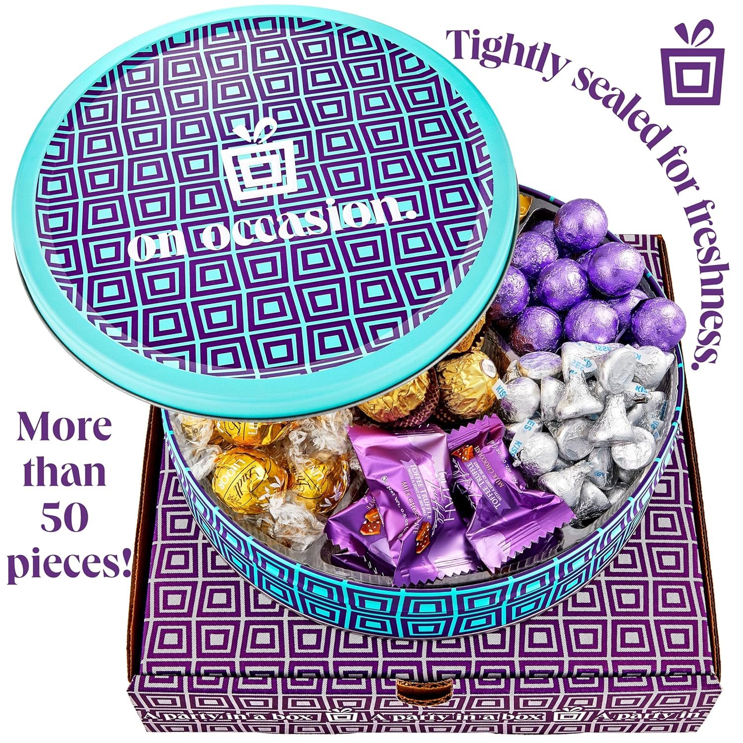 Celebrate with Magic: Our elegant and unique designs are beautiful inside and out – and include 50 pieces assorted chocolate in 7 flavors! From rich and creamy, dark, and milk chocolates to sea salt and hazelnut truffles.