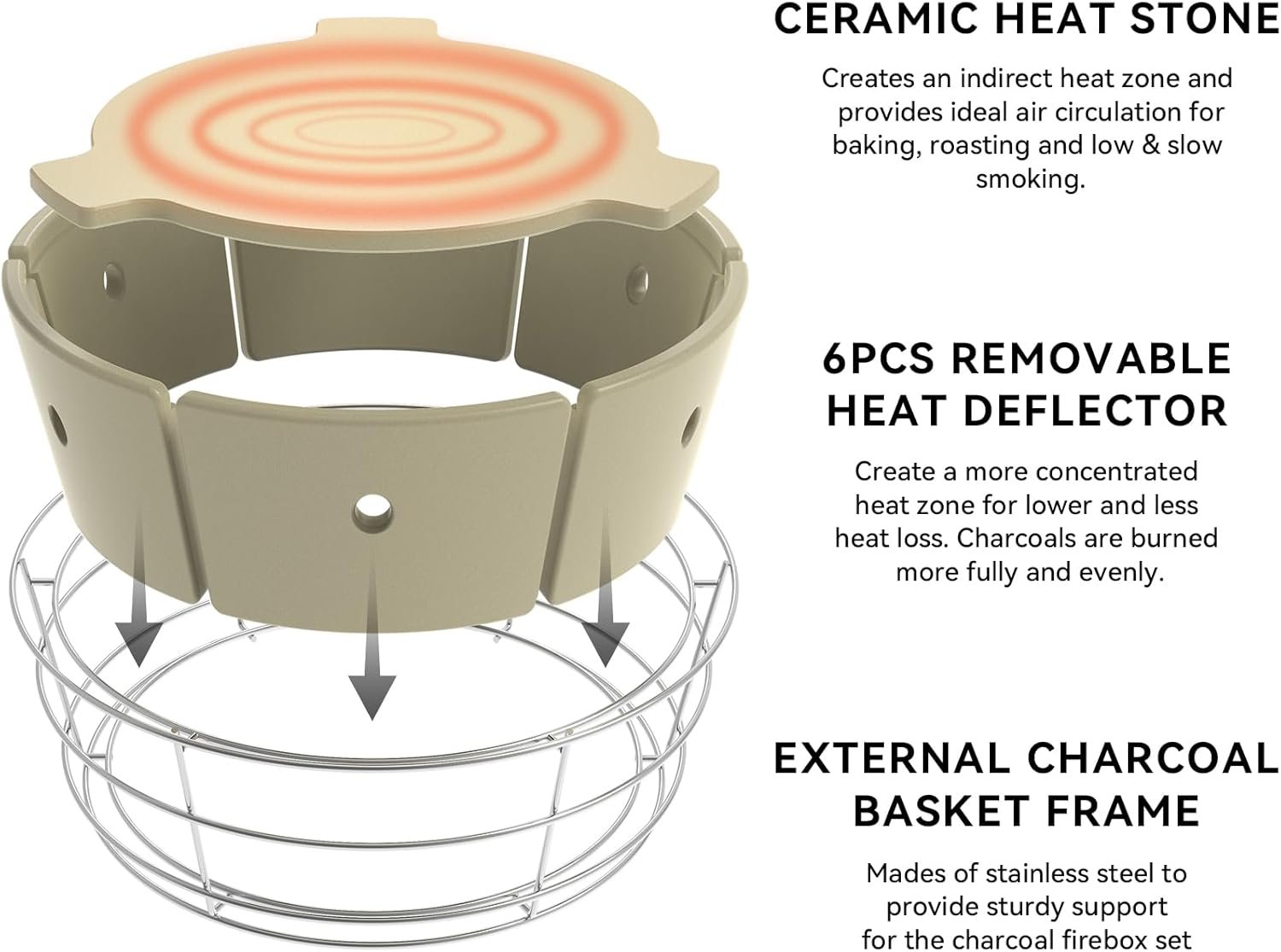 【All-in-One Smoker & Roaster Kit】 Why buy separate parts when you can have it all? This kit includes a matching ceramic heat stone that works with the basket to create a complete convection cooking system. Place the stone over the coals to block direct flame, turning your kettle into a professional rotisserie or oven. Bake pizzas, roast veggies, or smoke meats with restaurant-quality, even heat—no more burnt bottoms.