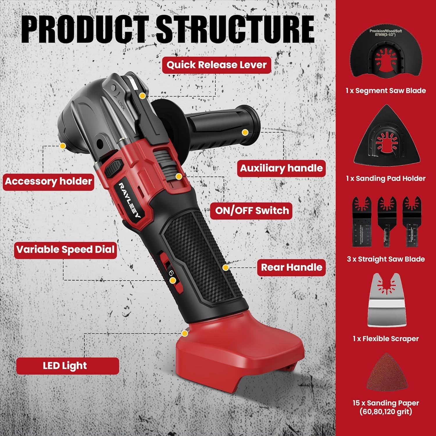 🛠️ 22-Piece Multi-Tool Kit Get the full set: 1x oscillating tool, 3x straight saw blades, 1x segment saw blade,1x flexible scraper,1x sanding pad holder,15 sanding papers and an auxiliary handle. Tackle cutting, sanding, scraping, and grinding tasks with ease — especially when paired with high-performance blades that slice through wood, pipe, and drywall like butter.