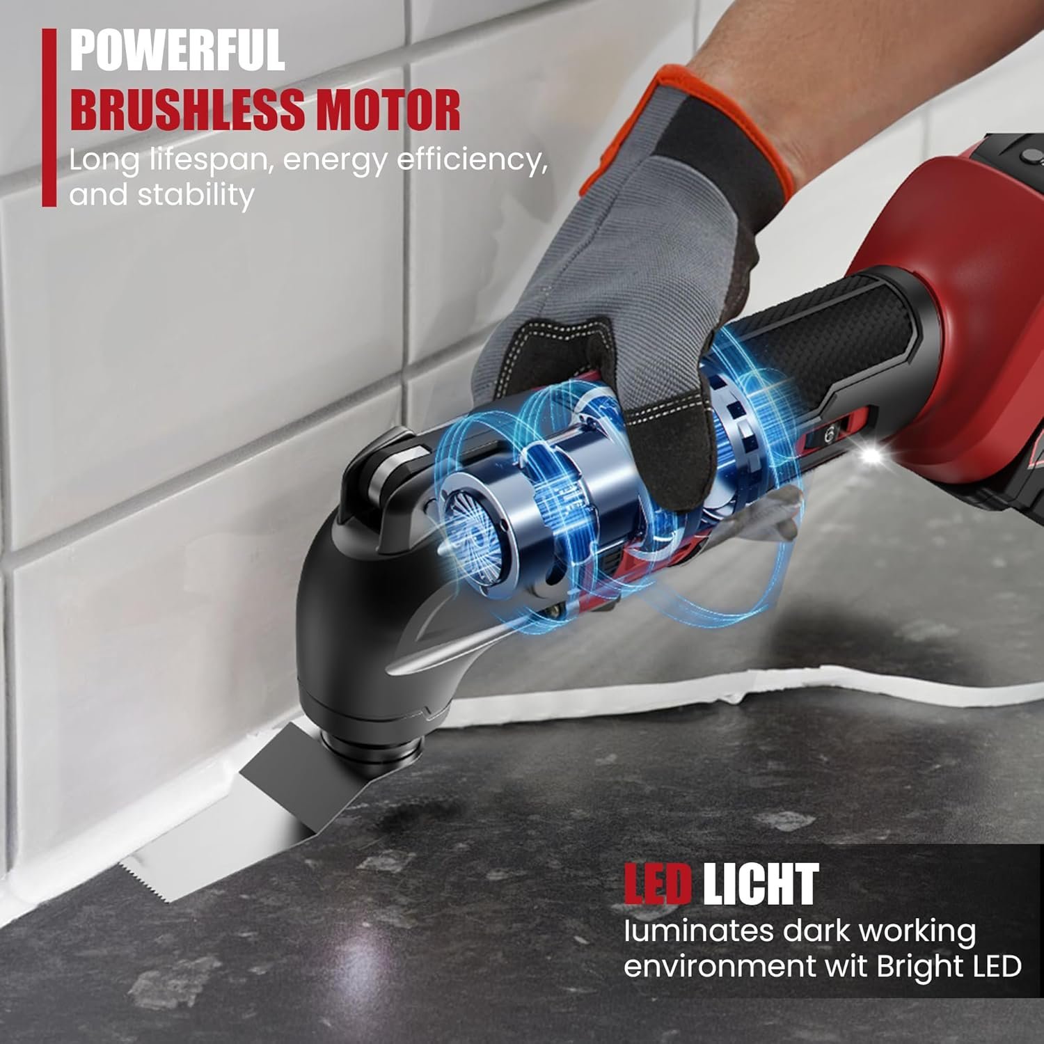 ⚡ Cordless Design & Brushless Motor Cut the cord — not the performance. Featuring a brushless motor, this oscillating tool boosts energy efficiency, extends runtime by up to 30%, and increases motor lifespan by 25%. Enjoy consistent power with minimal maintenance and no performance drop over time.